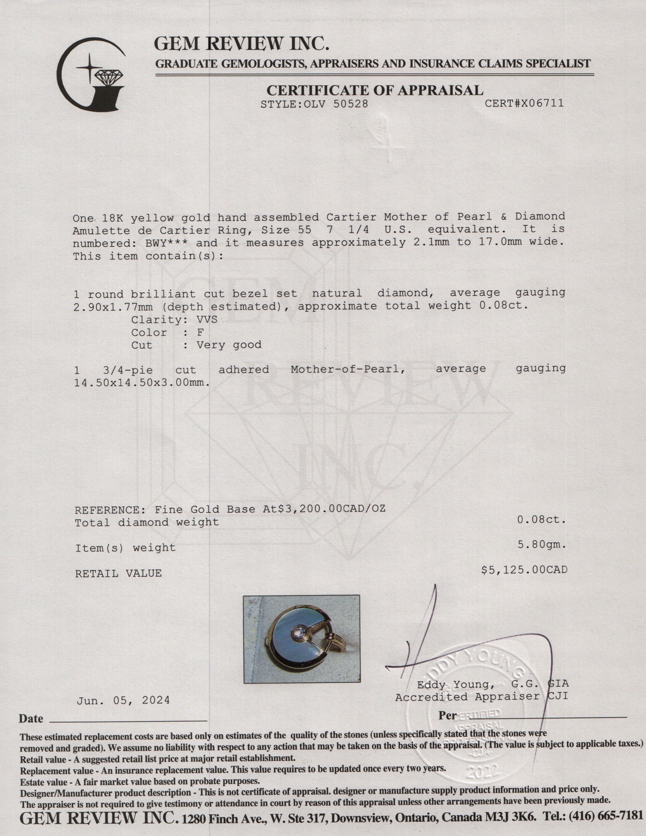 18k Yellow Gold Mother of Pearl & Diamond Amulette de Ring, Size 55 7 1/4