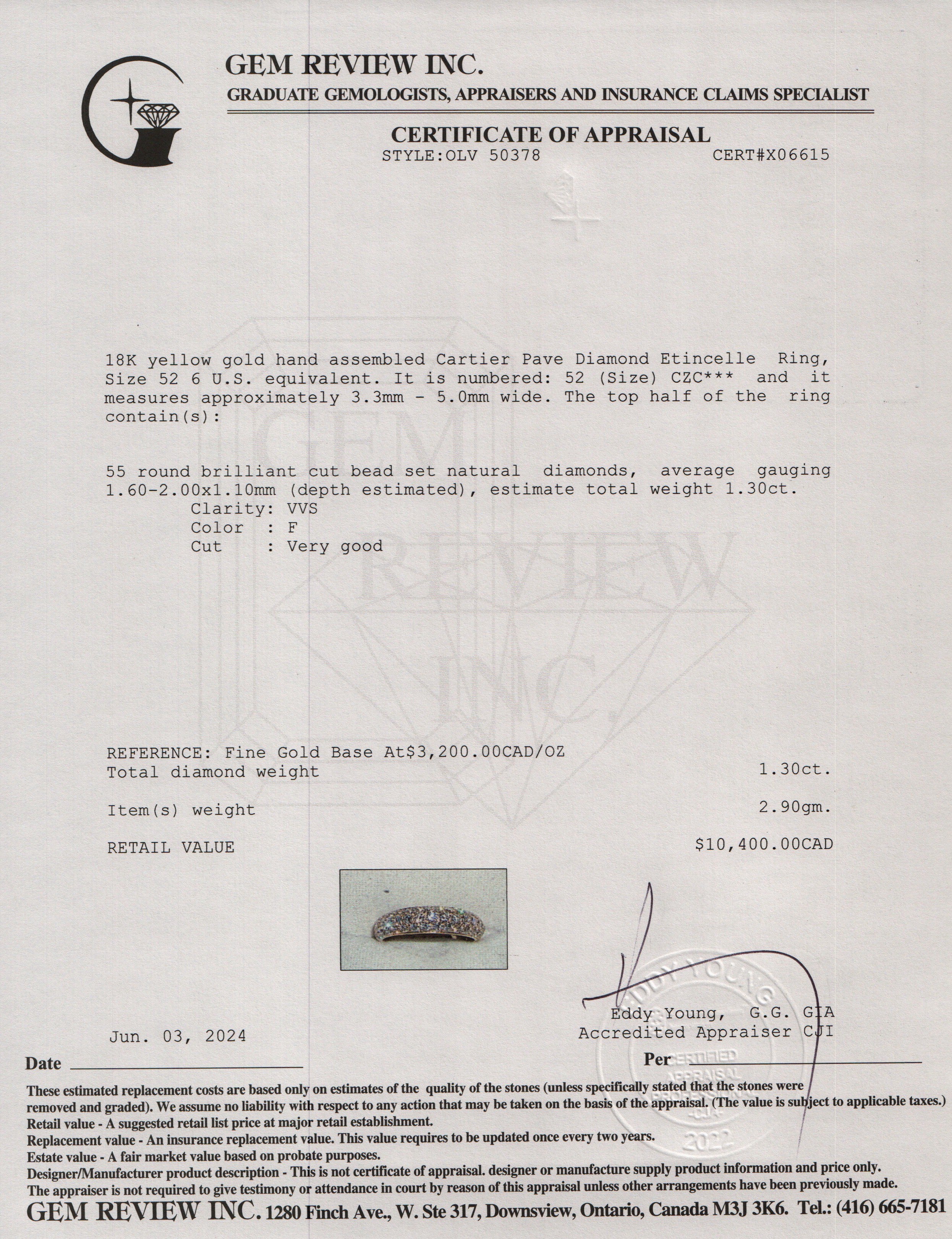 18k Yellow Gold Pave Diamond Etincelle Ring, Size 52 6 w/ Box, Receipt & Certificate