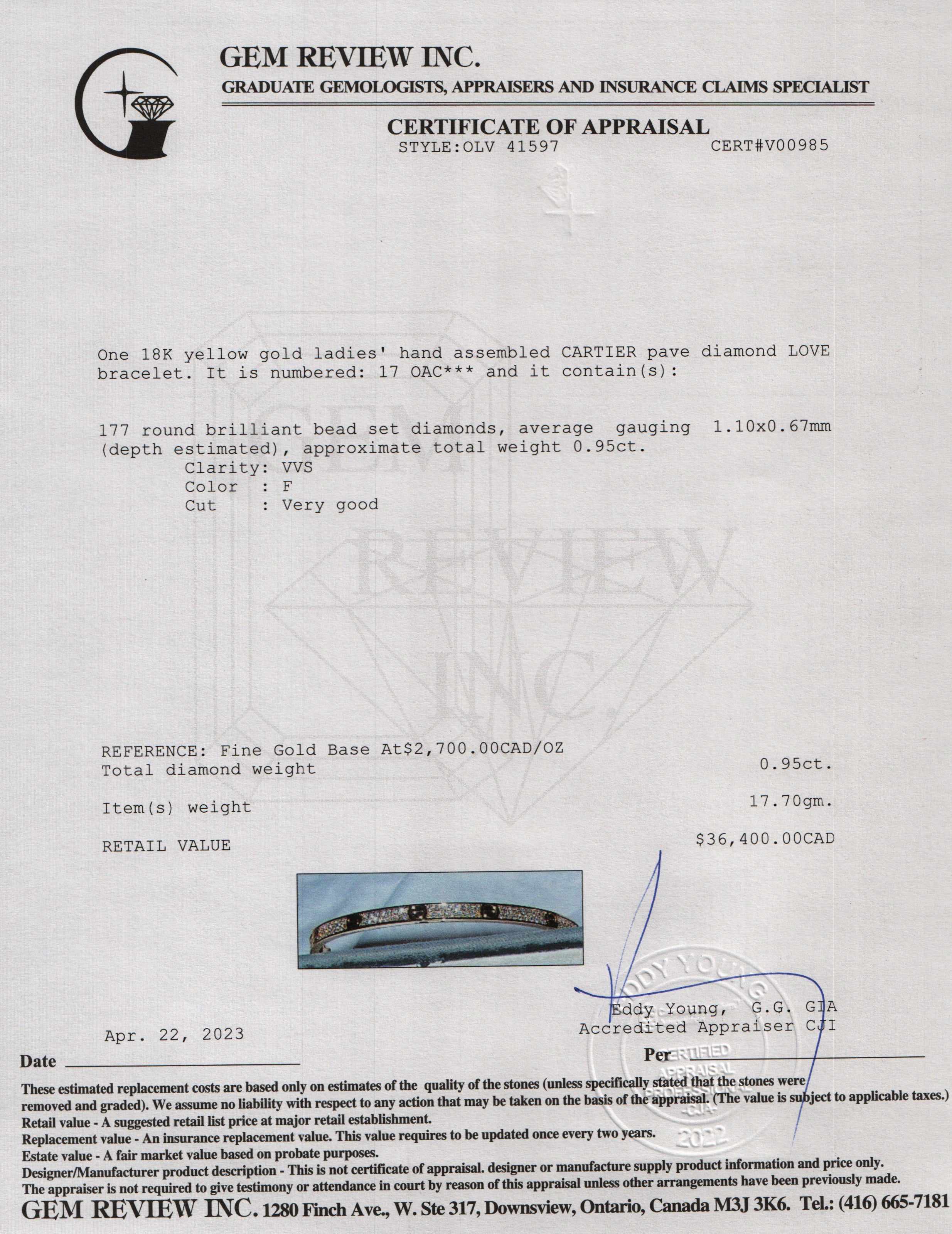18k Yellow Gold Paved Diamond Love Bracelet, Small Model w/ Box & Certificate