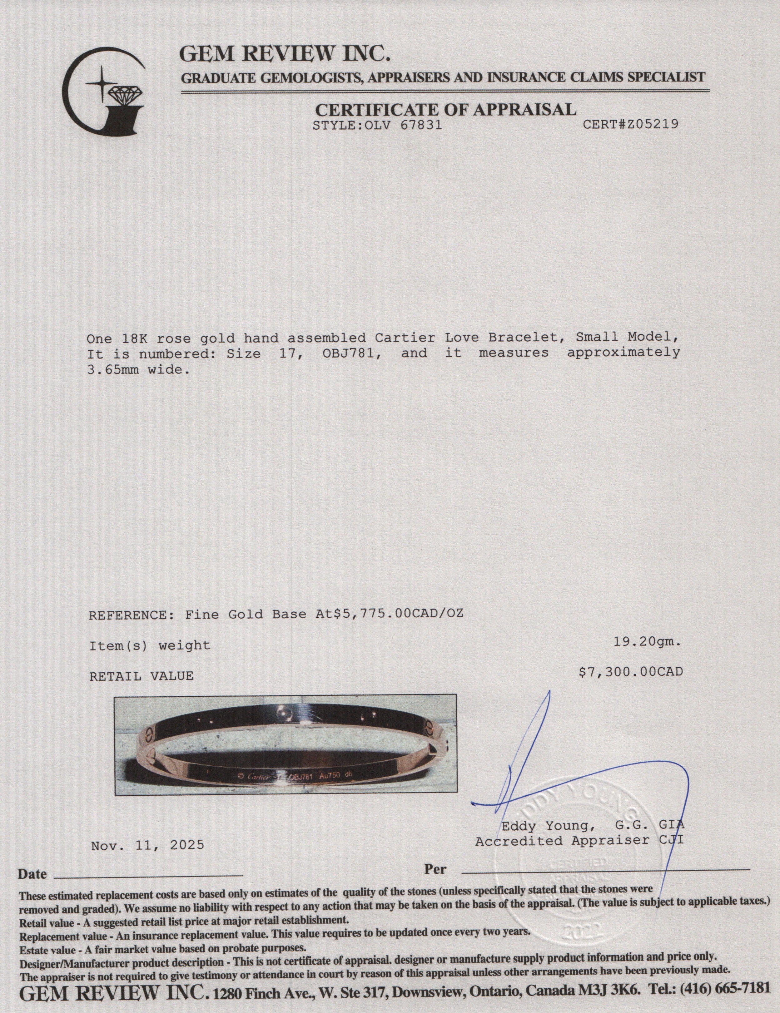 2021 18k Rose Gold 3.65 MM Love Bracelet, Small Model, Size 17 w/ Pouch & Certificate