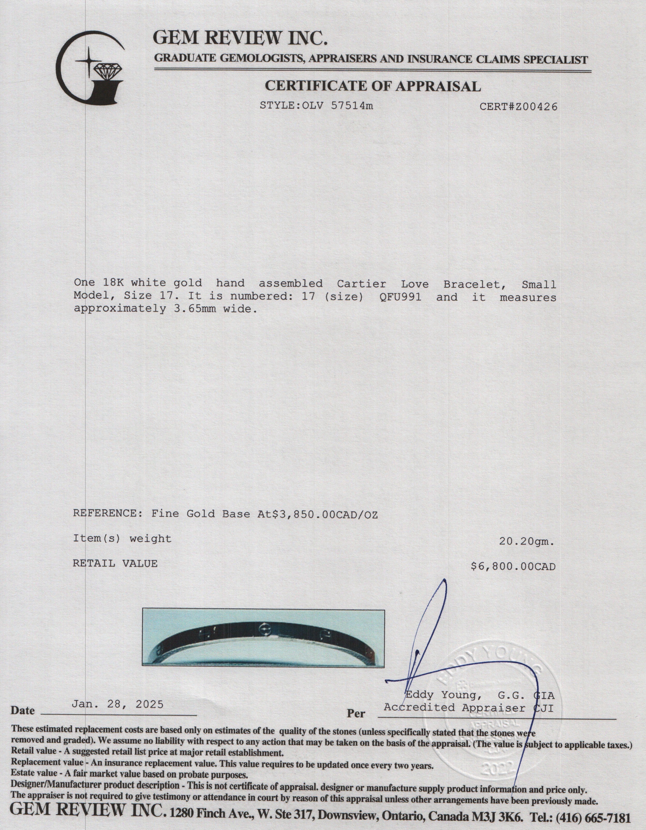 2022 18k White Gold 3.65 MM Love Bracelet, Small Model, Size 17 w/ Box, Receipt & Certificate