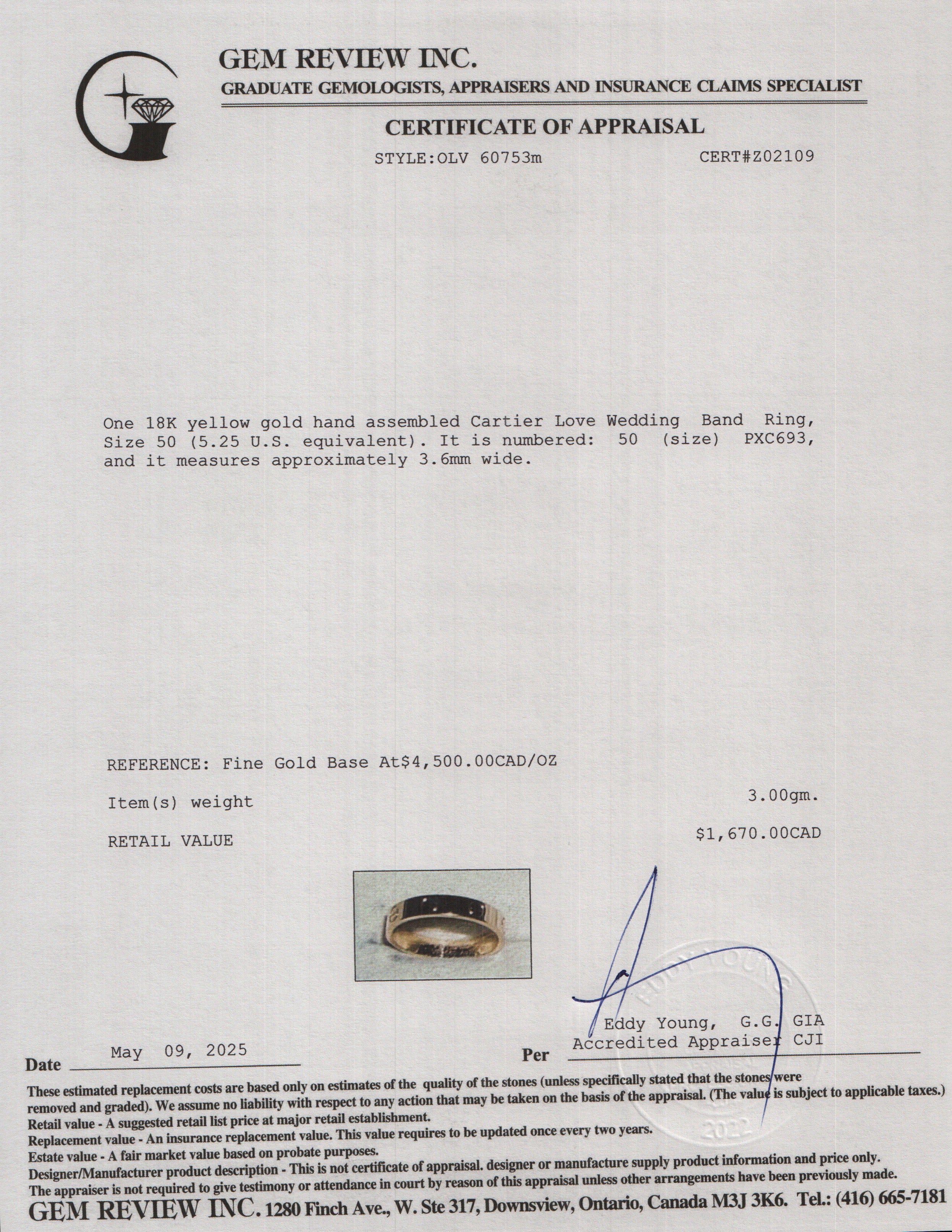2022 18k Yellow Gold 3.6 mm Love Wedding Band Ring, Size 50 5.25 w/ Box & Receipt