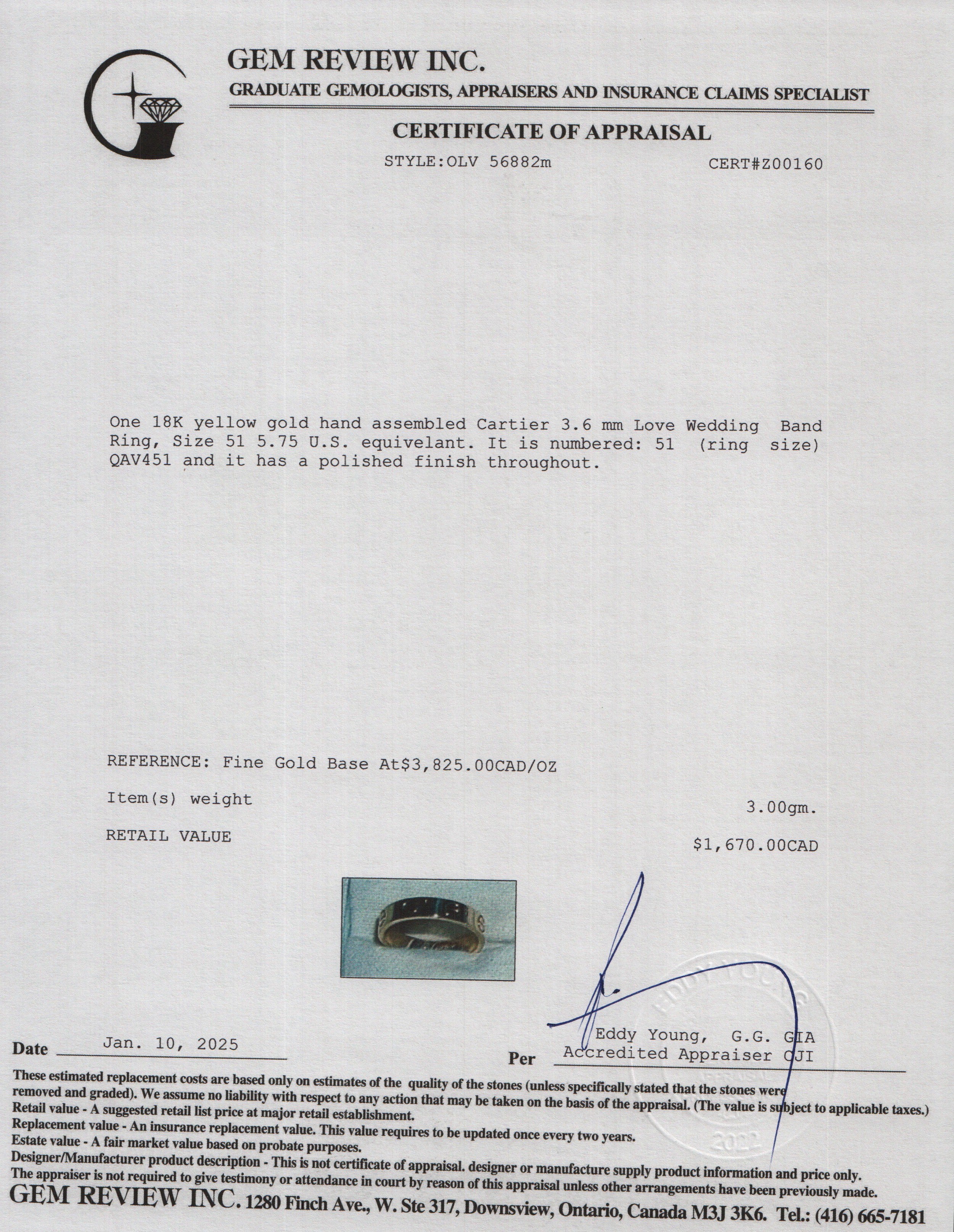 2022 18k Yellow Gold 3.6 mm Love Wedding Band Ring, Size 51 5.75 w/ Box & Certificate