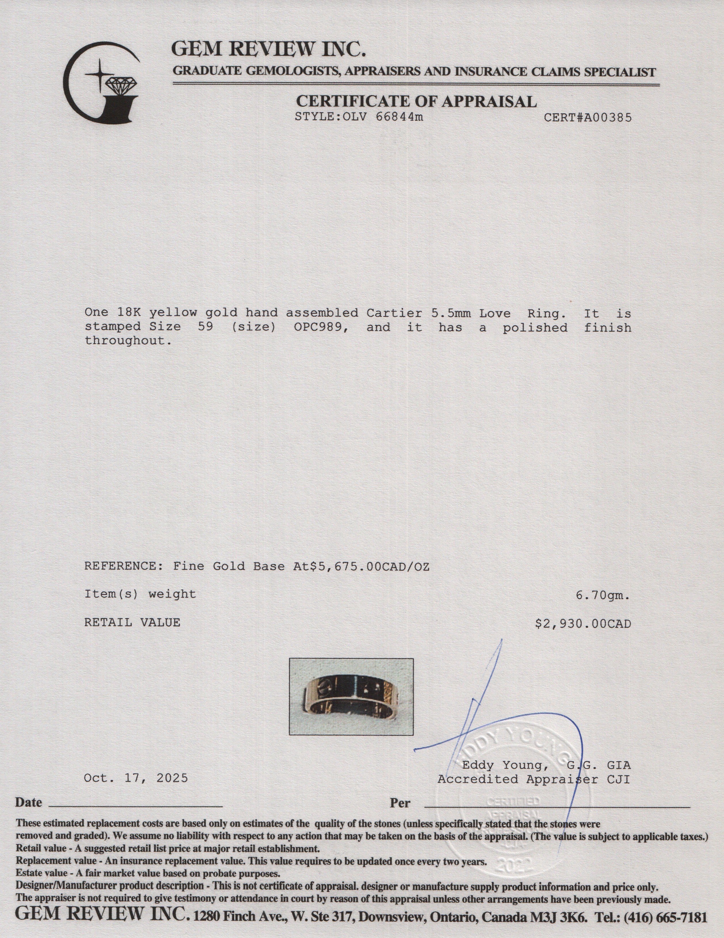 2022 18k Yellow Gold 5.5 MM Love Ring, Classic Model, Size 59 8.75 w/ Box, Receipt & Certificate