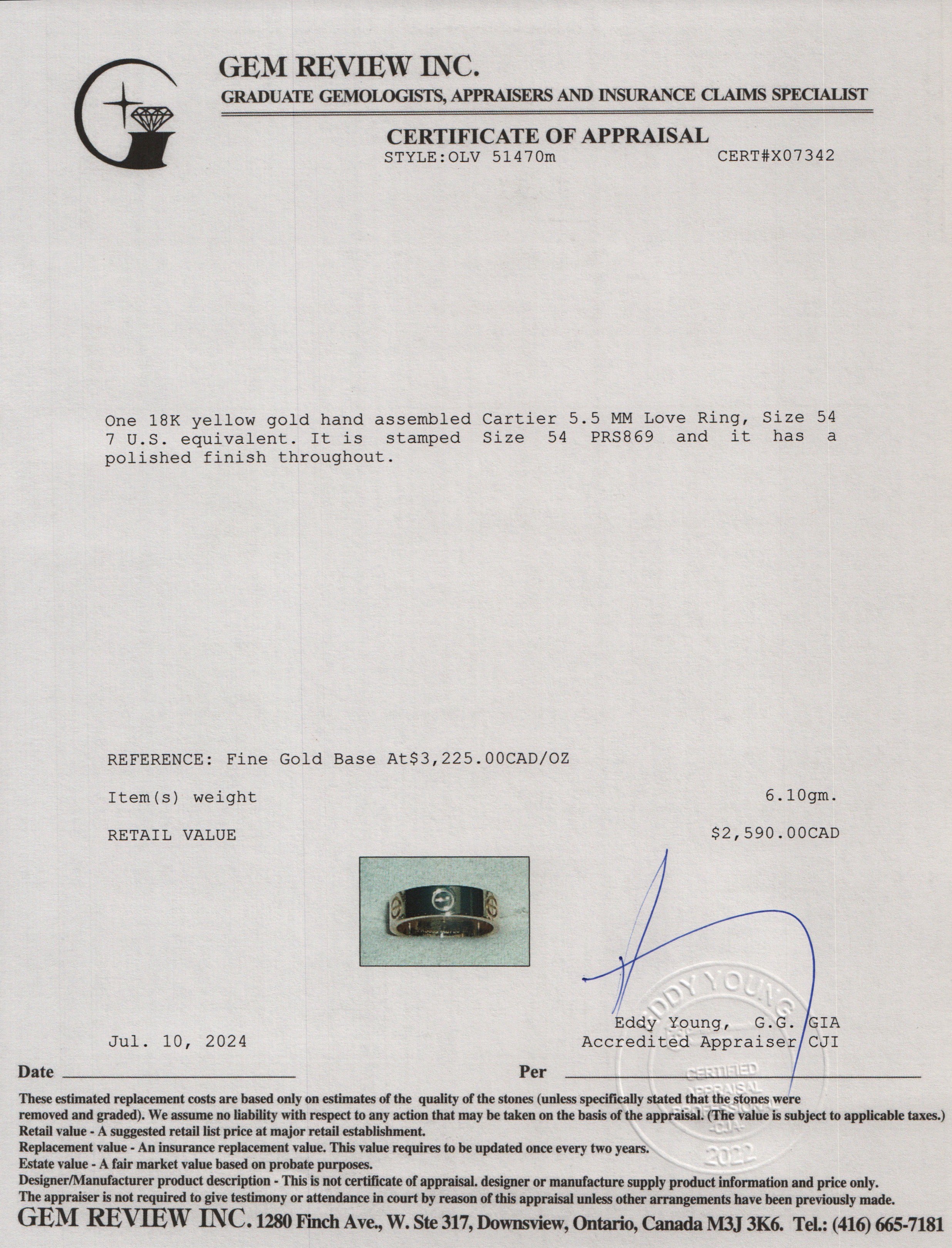 2022 18k Yellow Gold 5.5 MM Love Ring, Size 54 7 w/ Box & Certificate