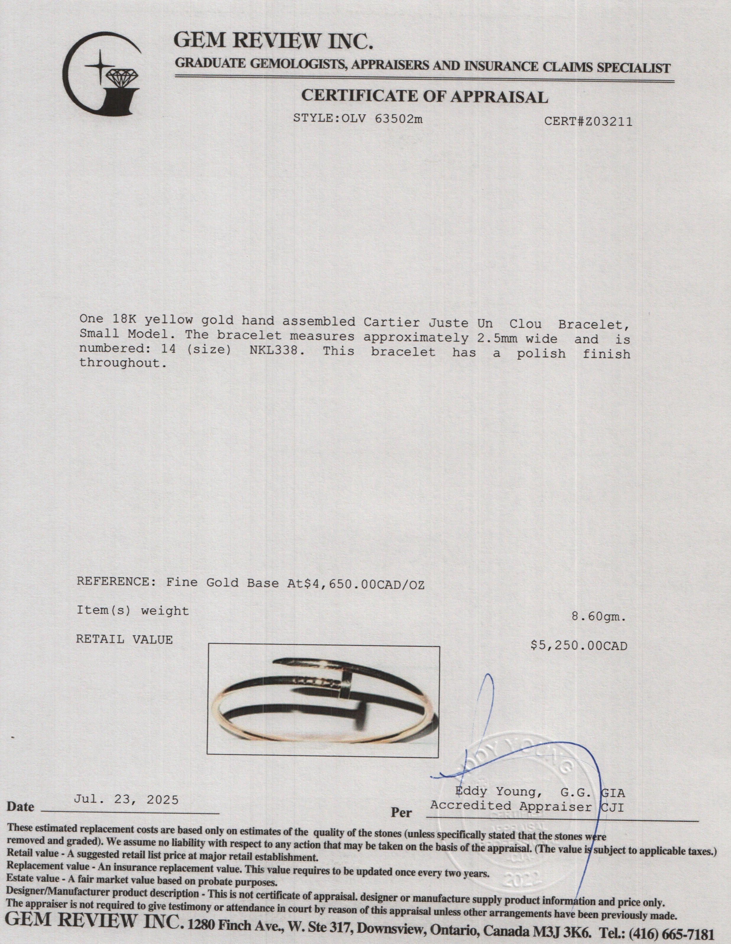 2022 18k Yellow Gold Juste Un Clou Bracelet, Small Model Size 14 w/ Box & Receipt