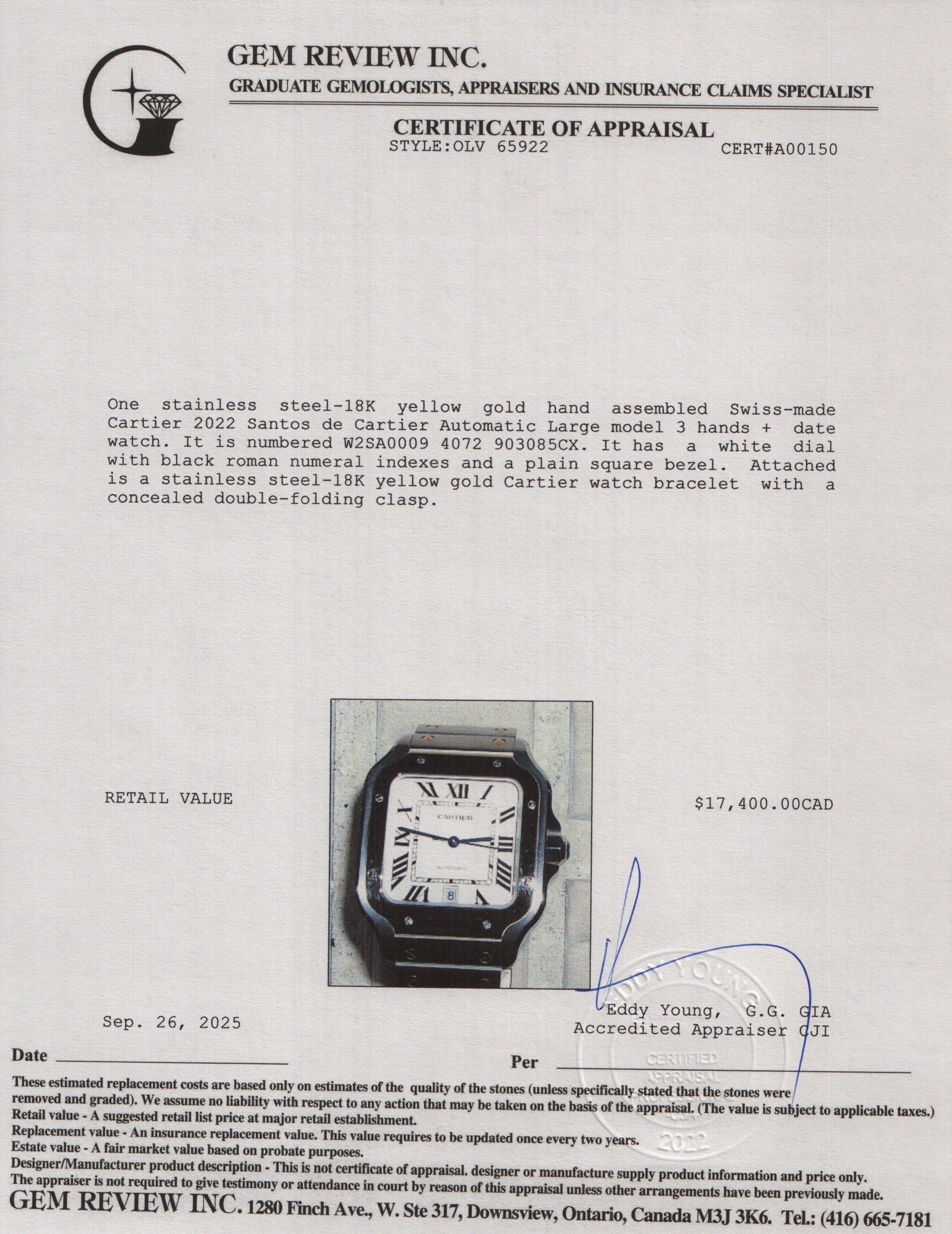 2022 Stainless Steel & 18k Yellow Gold Santos de Automatic Watch, Large Model 4072 w/ Box, Papers & Extra Strap