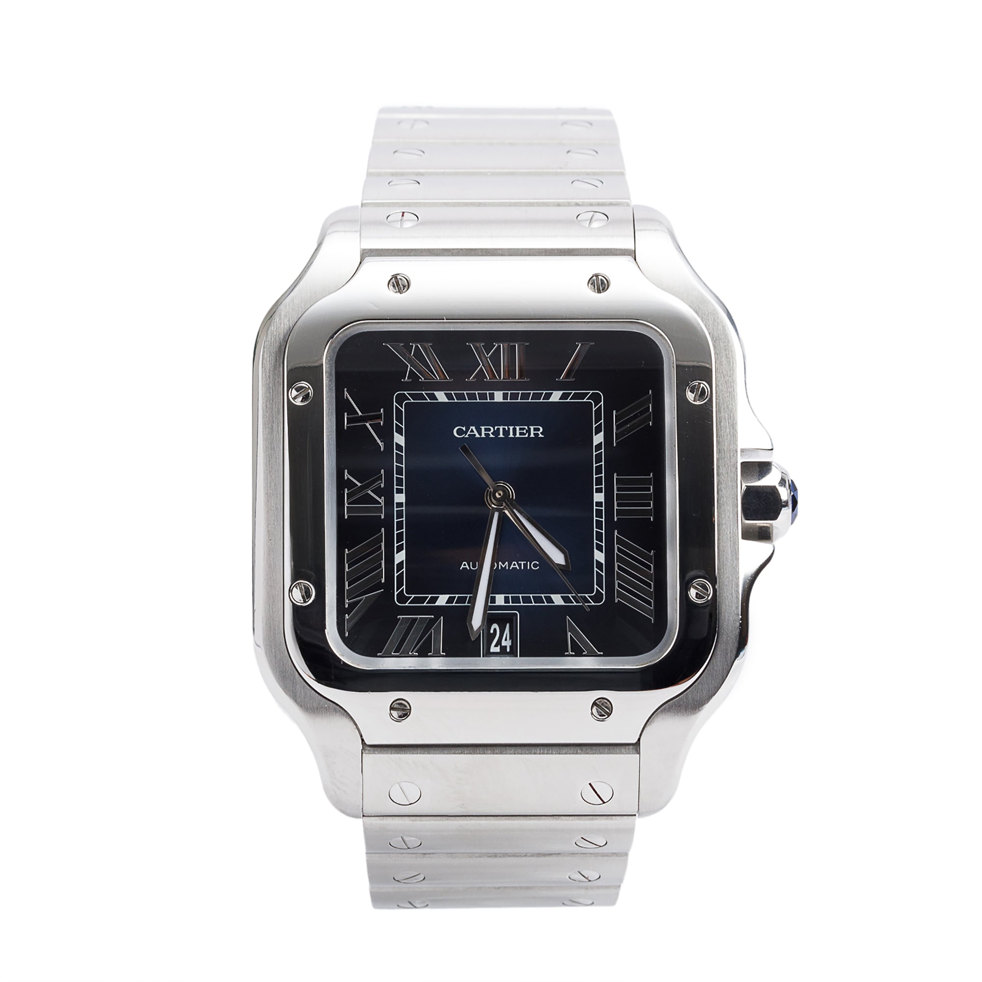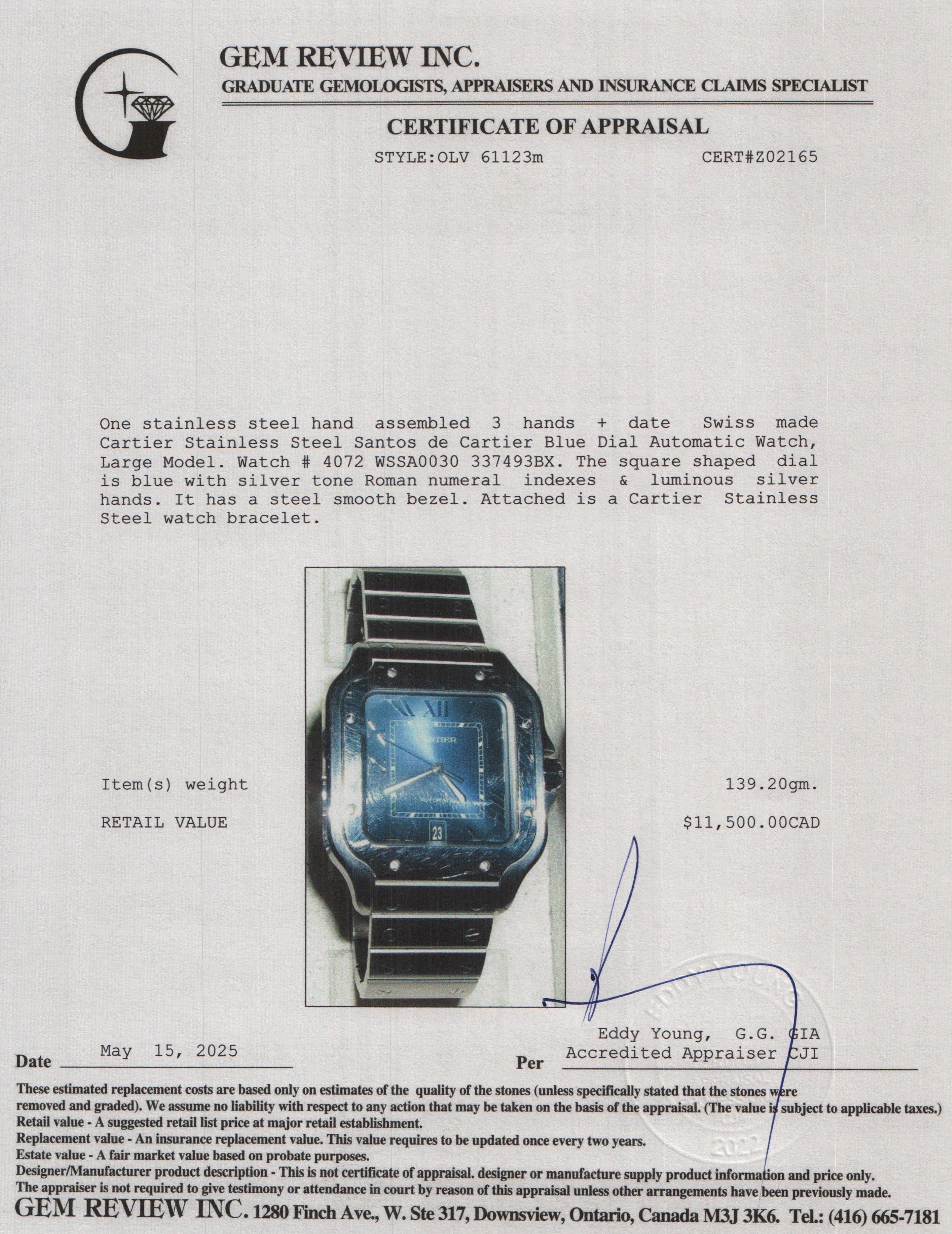 2022 Stainless Steel Santos de Blue Dial Automatic Watch, Large Model 4072 w/ Box, Papers & Extra Strap