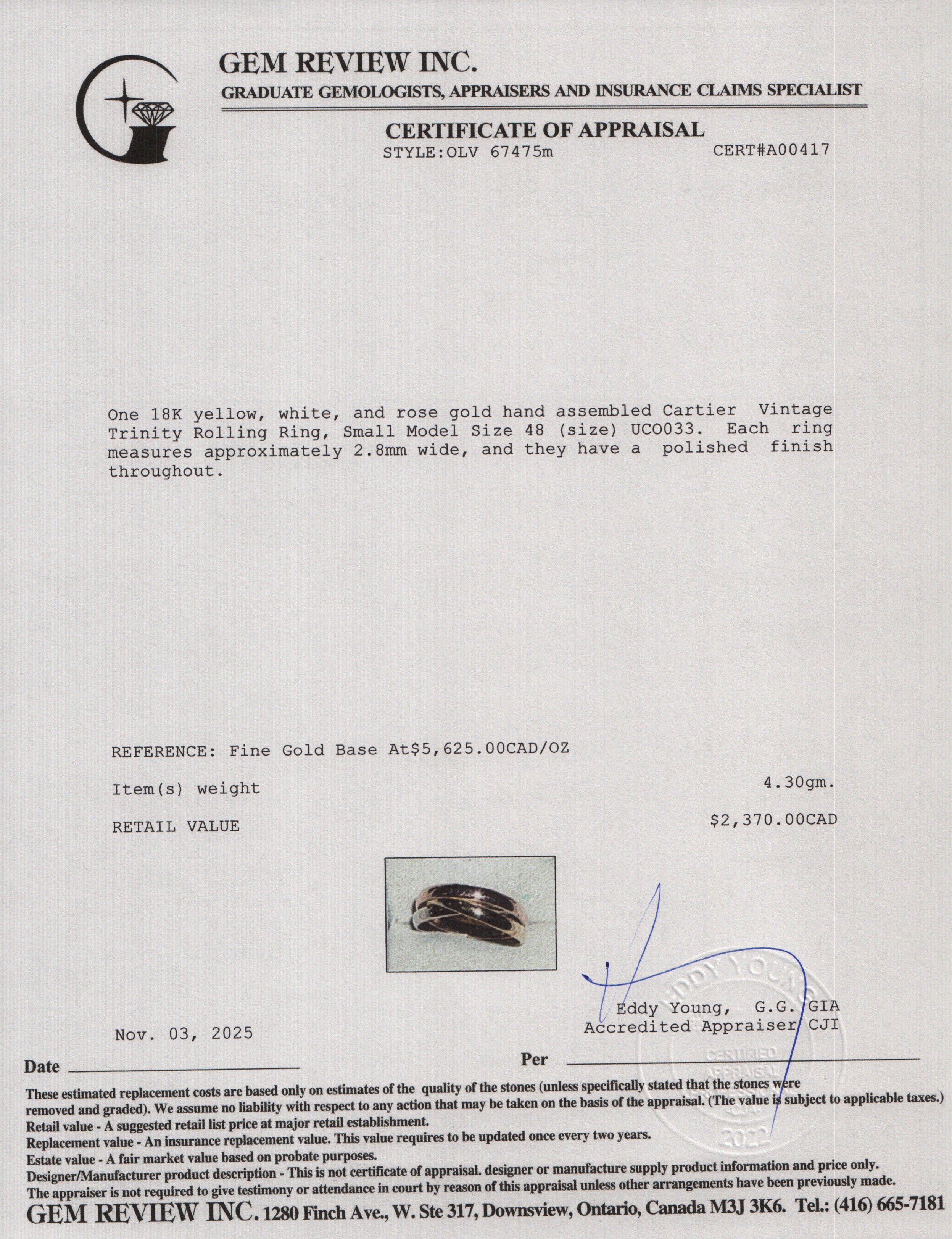 2023 18k Tri-Gold Trinity Rolling Ring, Small Model Size 48 4.75 w/ Box & Certificate