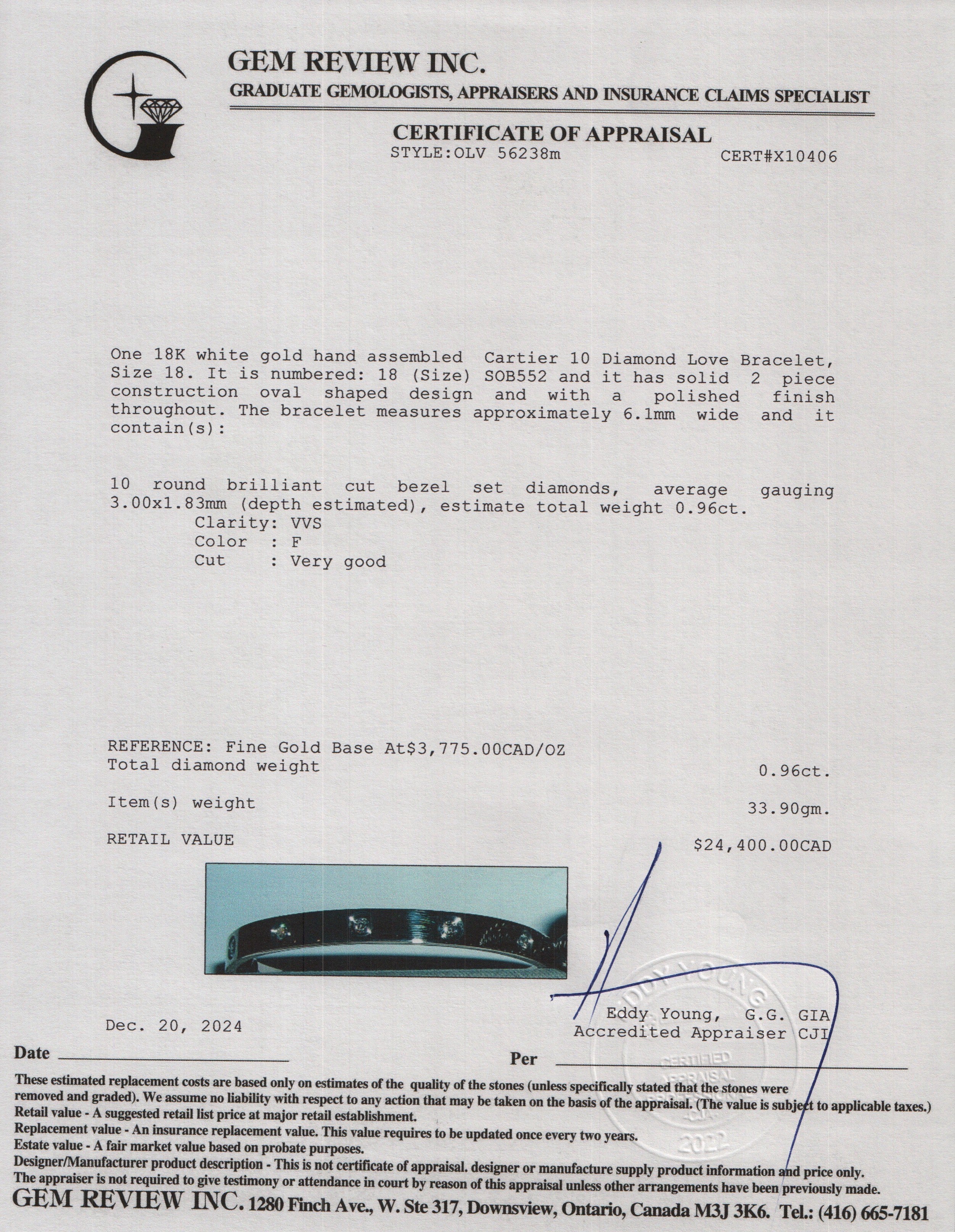 2023 18k White Gold 10 Diamond Love Bracelet, Size 18 w/ Certificate