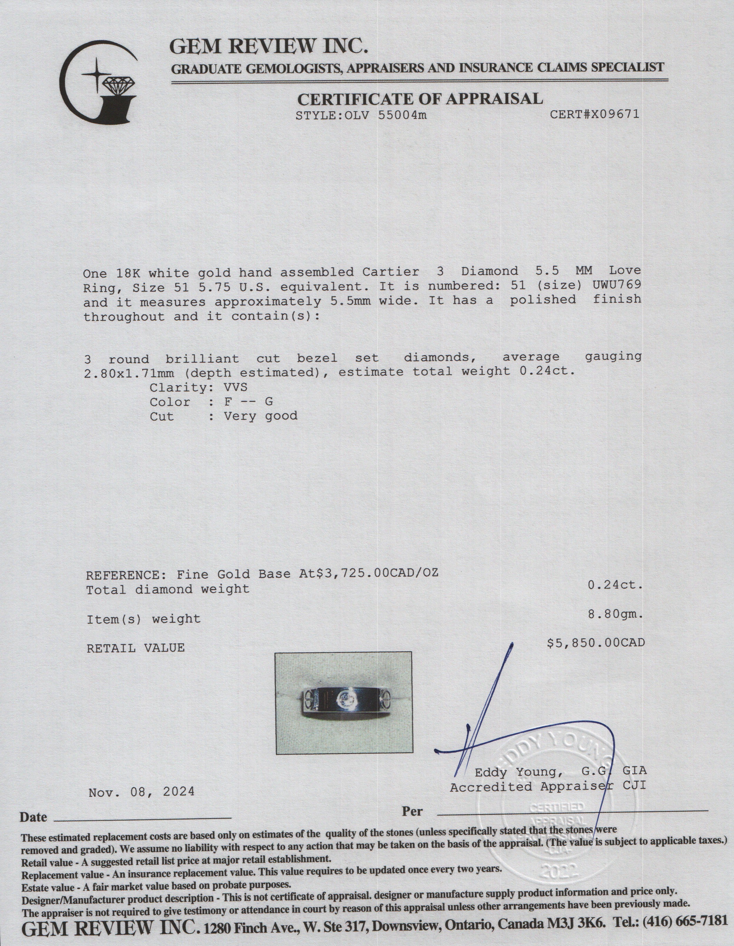 2023 18k White Gold 3 Diamond 5.5 MM Love Ring, Size 51 5.75 w/ Certificate