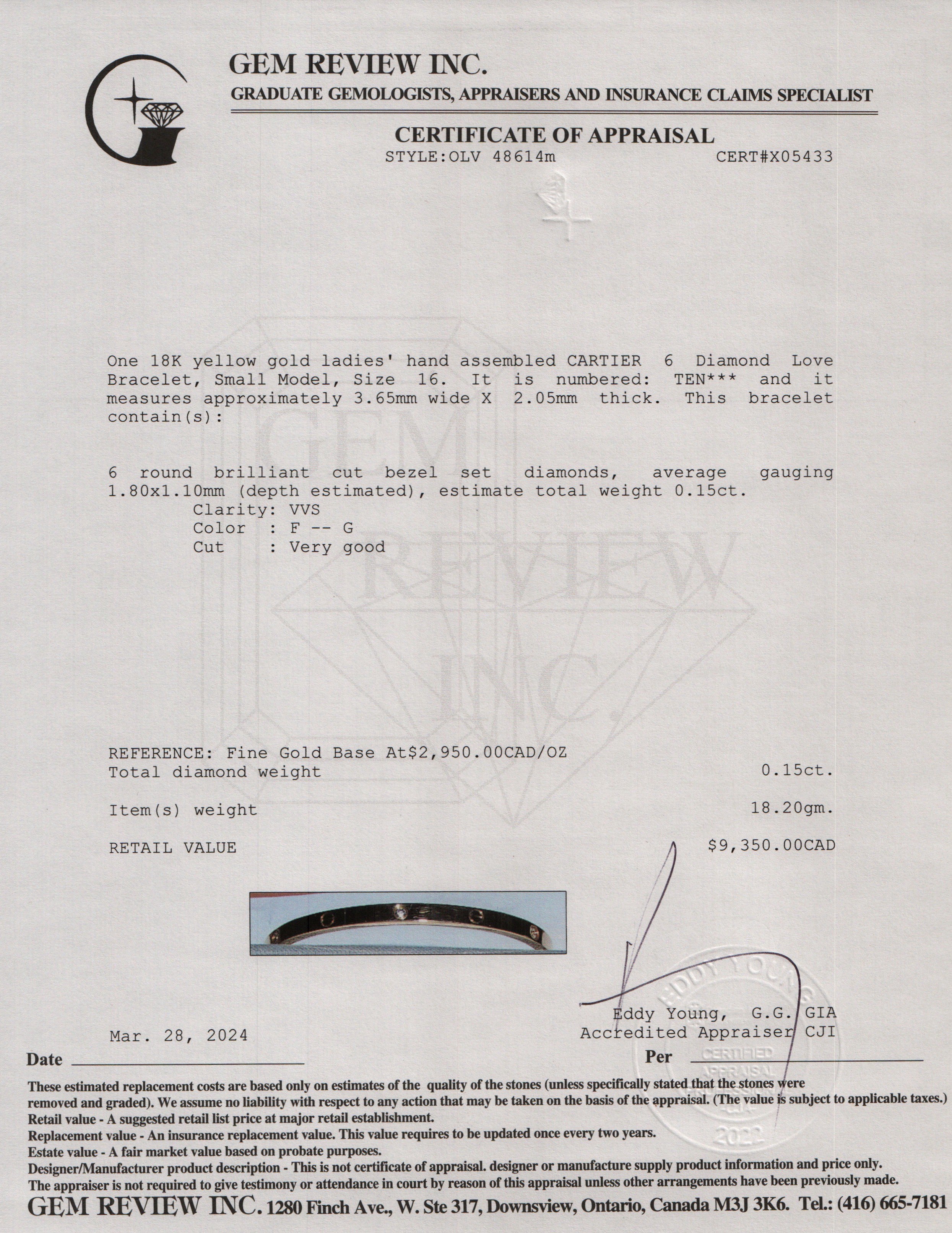 2023 18k Yellow Gold 6 Diamond Love Bracelet, Small Model, Size 16 w/ Box, Receipt & Certificate