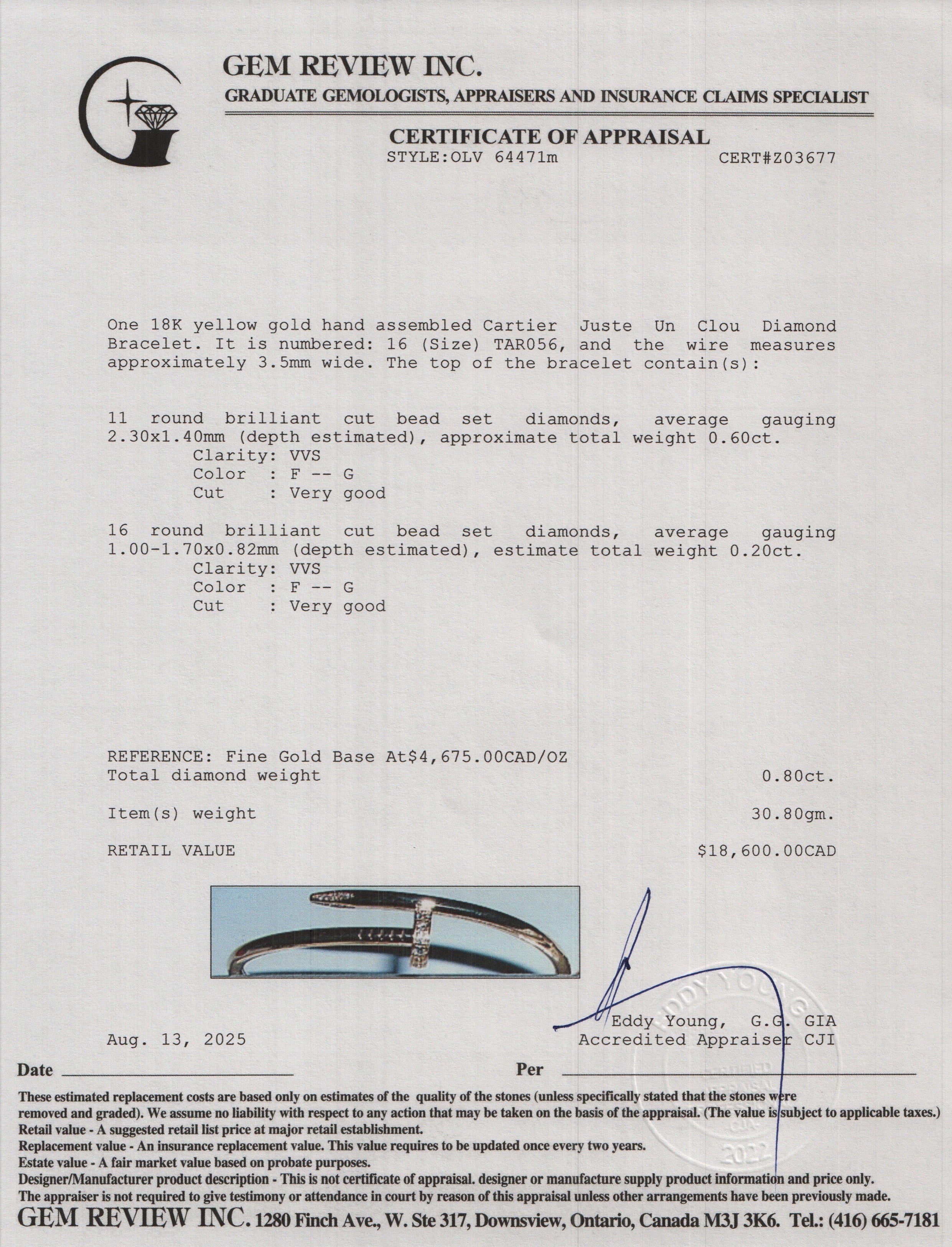 2023 18k Yellow Gold Juste Un Clou Diamond Bracelet, Size 16 w/ Box & Certificate