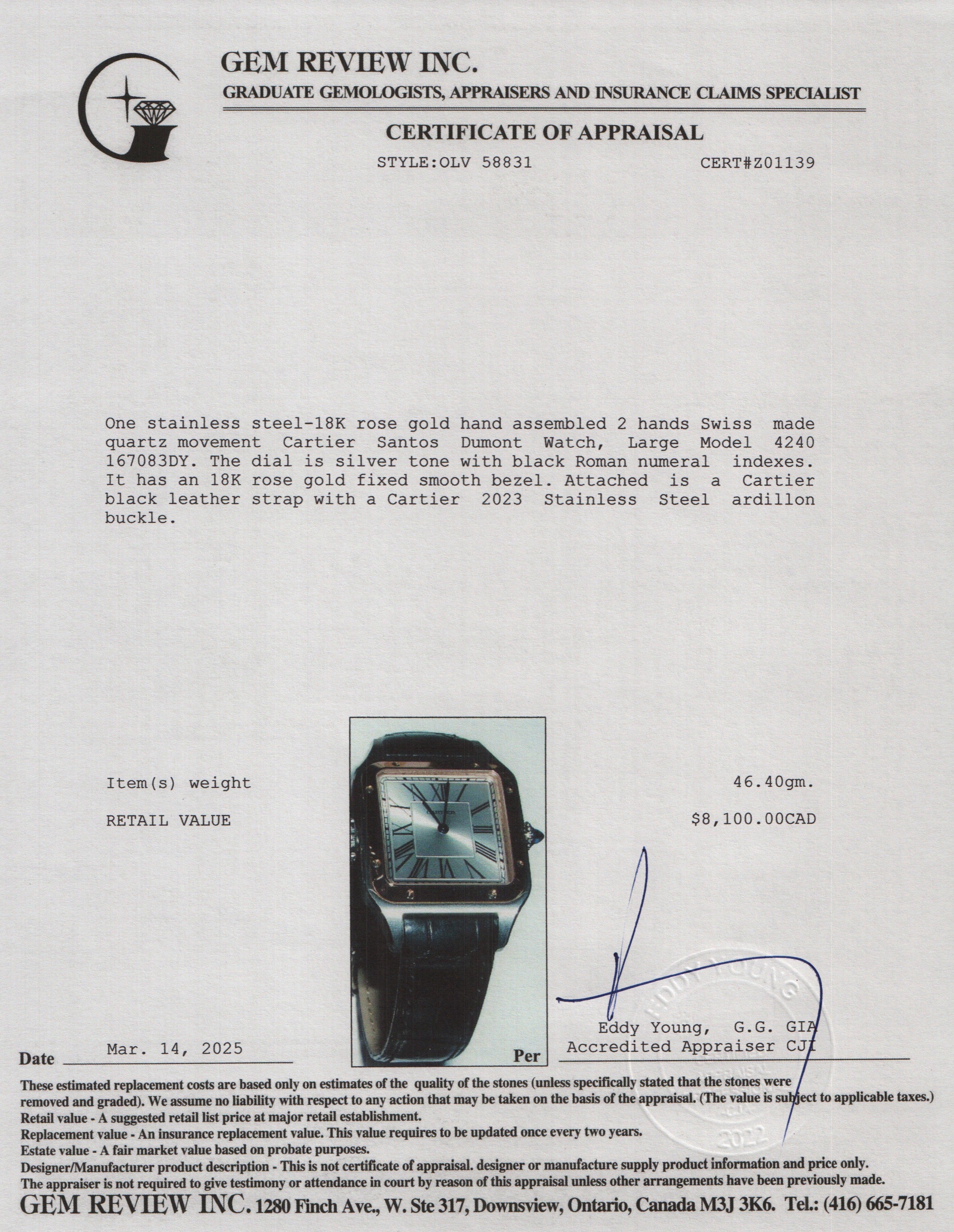 2023 Stainless Steel & 18k Rose Gold Santos Dumont Watch, Large Model 4240 w/ Box & Papers