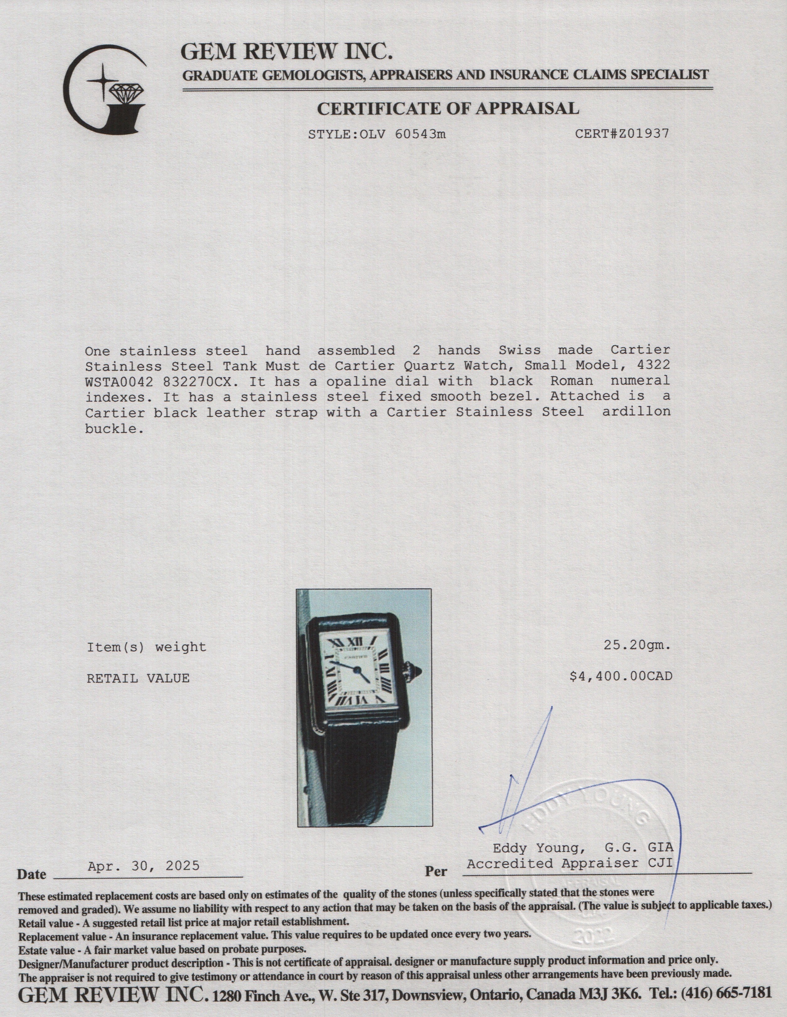 2023 Stainless Steel Tank Must de Quartz Watch, Small Model 4322 w/ Box & Papers