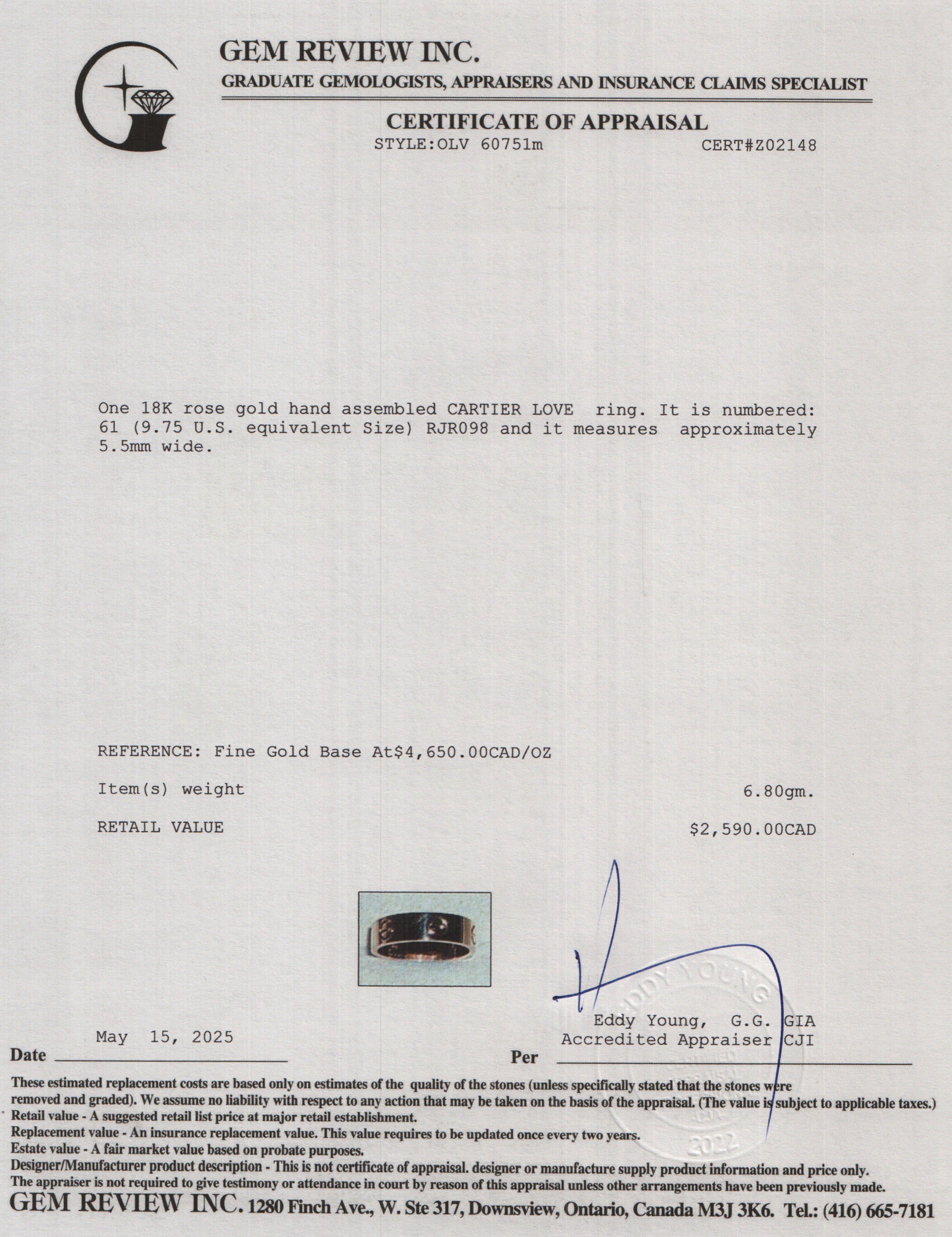 2024 18k Rose Gold 5.5 MM Love Ring, Size 61 9.75 w/ Box, Receipt & Certificate