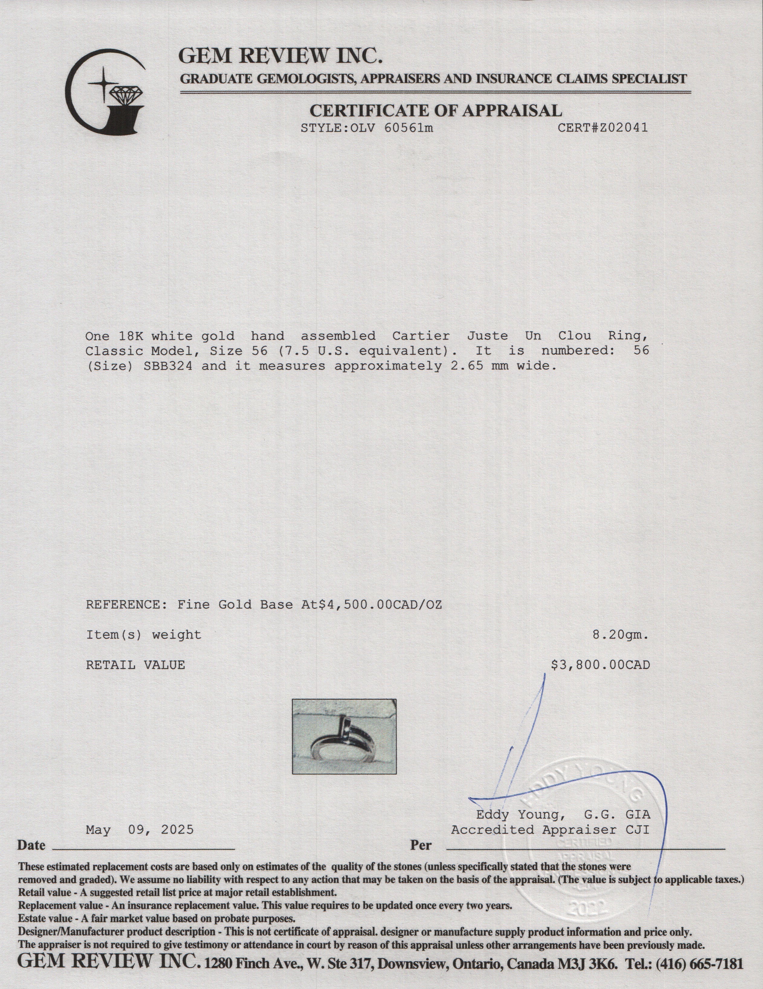 2024 18k White Gold Juste Un Clou Ring, Classic Model, Size 56 7.5 w/ Receipt