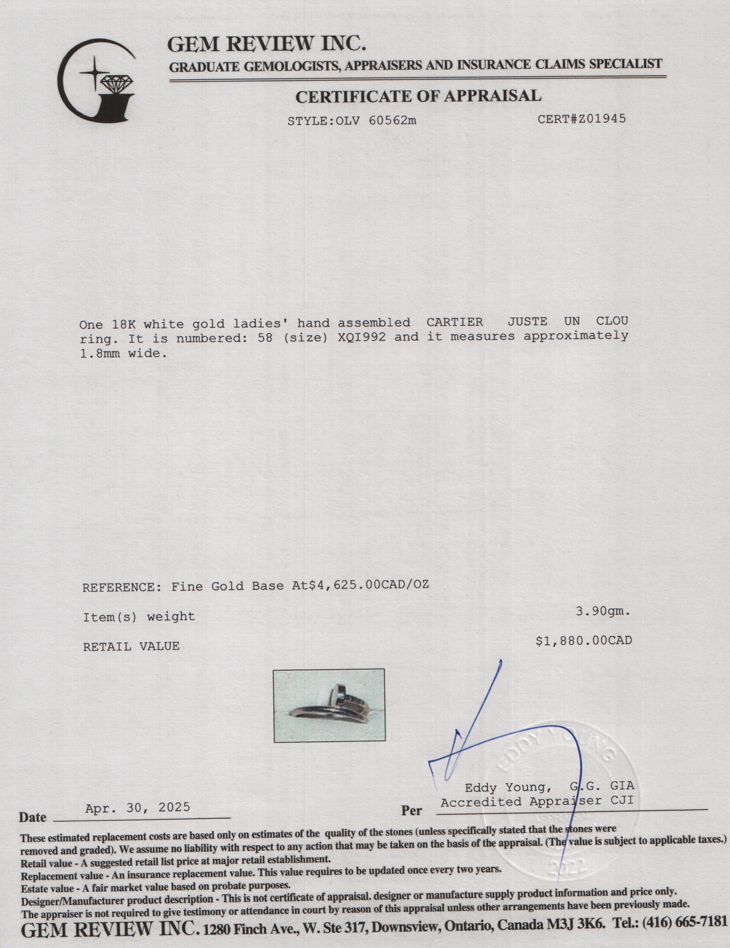 2024 18k White Gold Juste Un Clou Ring, Small Model, Size 58 8.25 w/ Receipt