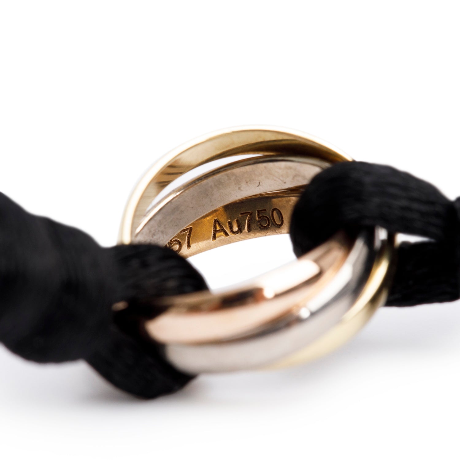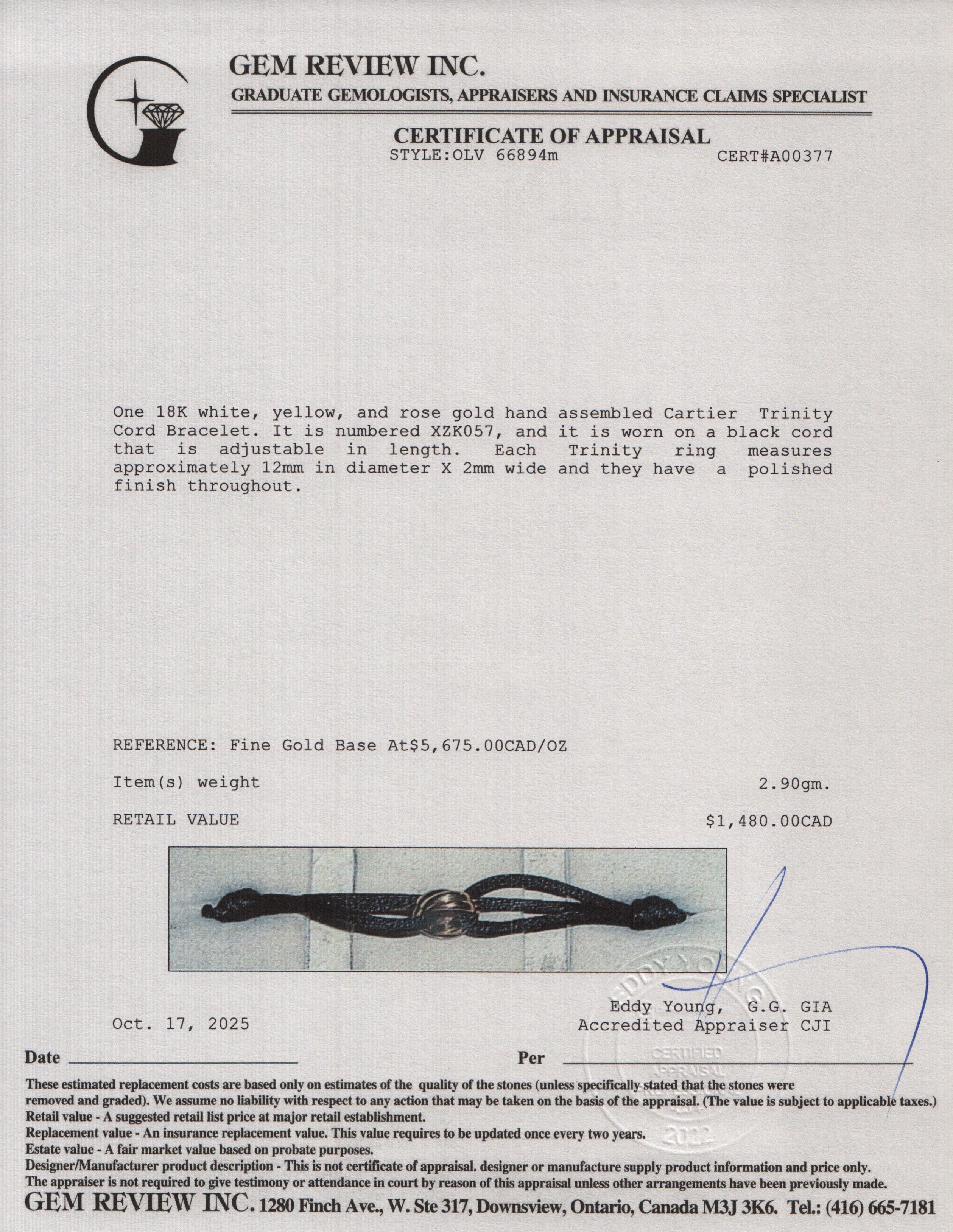 2024 18k White, Yellow & Rose Gold Trinity Black Cord Bracelet w/ Box & Certificate