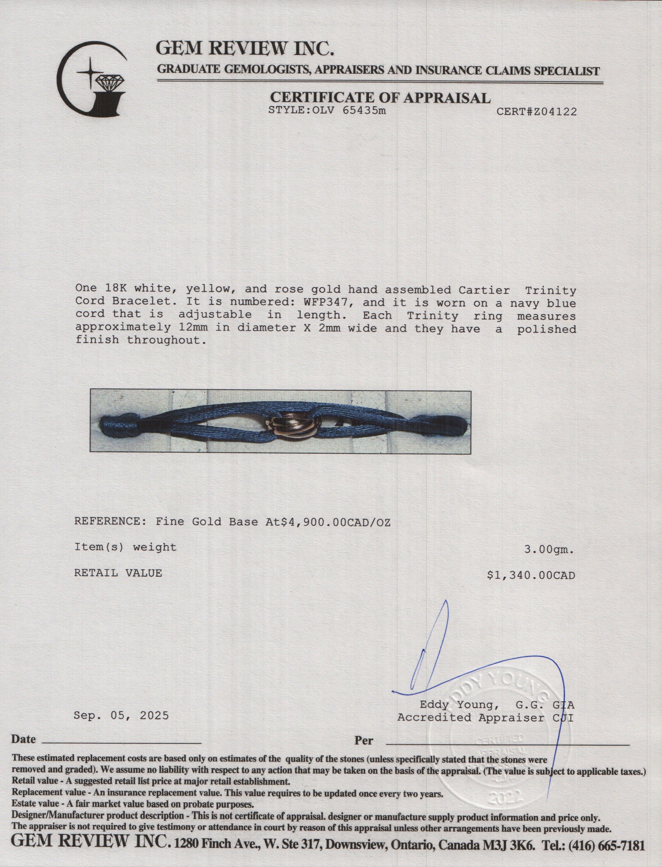 2024 18k White, Yellow & Rose Gold Trinity Cord Bracelet w/ Box & Certificate