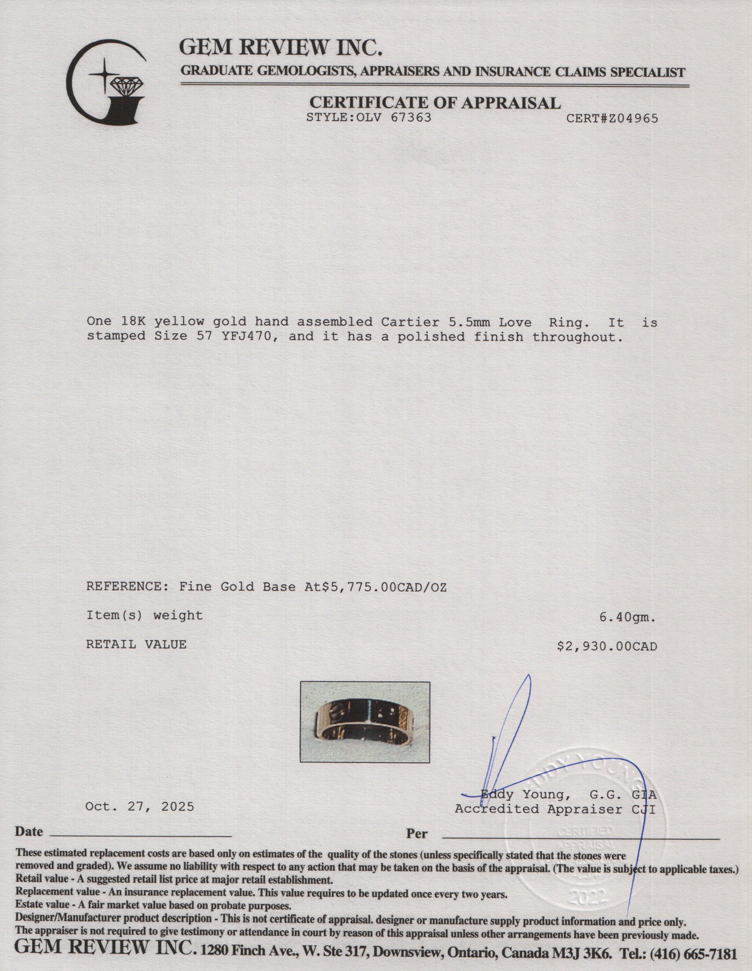2024 18k Yellow Gold 5.5 MM Love Ring, Classic Model, Size 57 8 w/ Box & Certificate