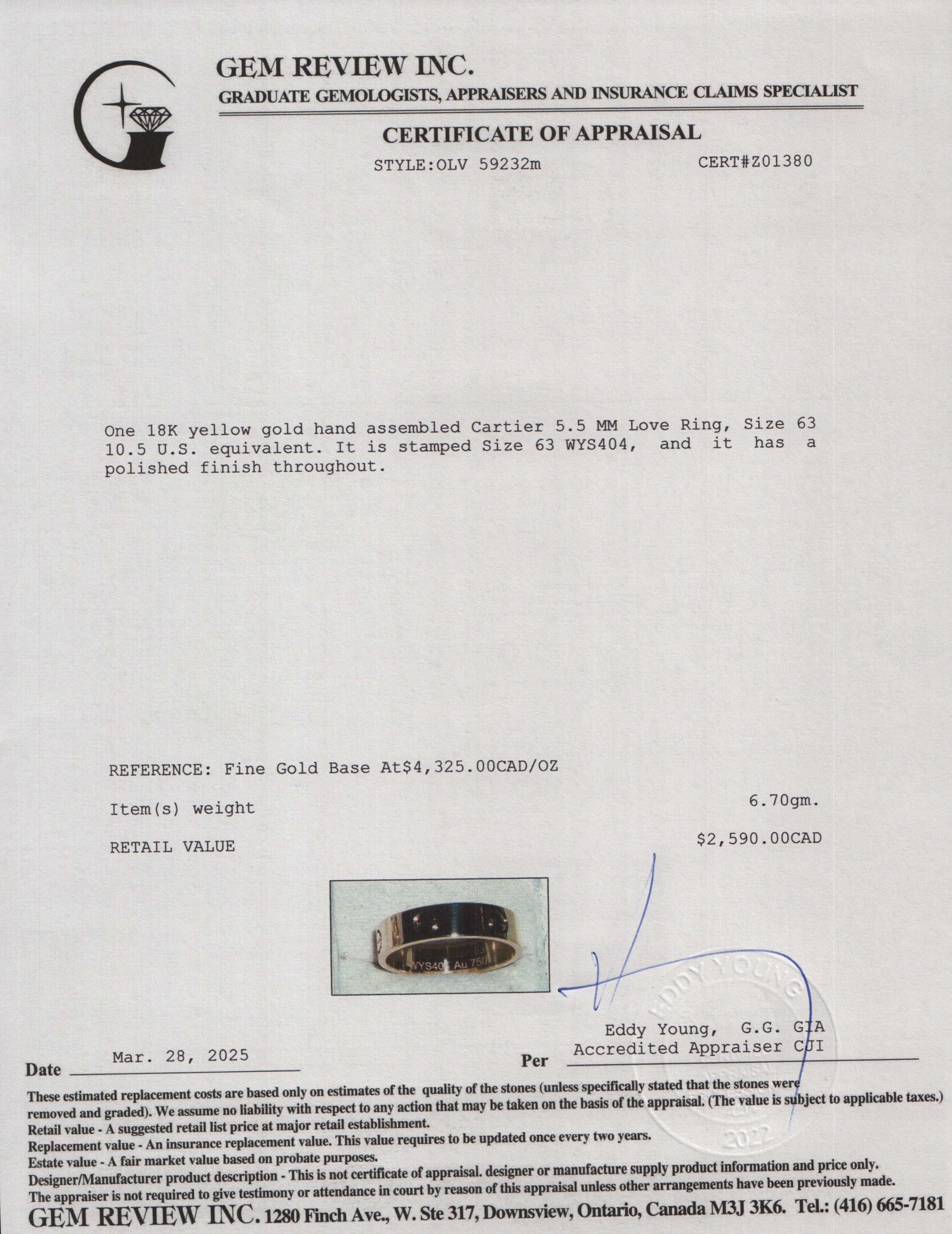 2024 18k Yellow Gold 5.5 MM Love Ring, Size 63 10.5 w/ Box, Certificate & Receipt