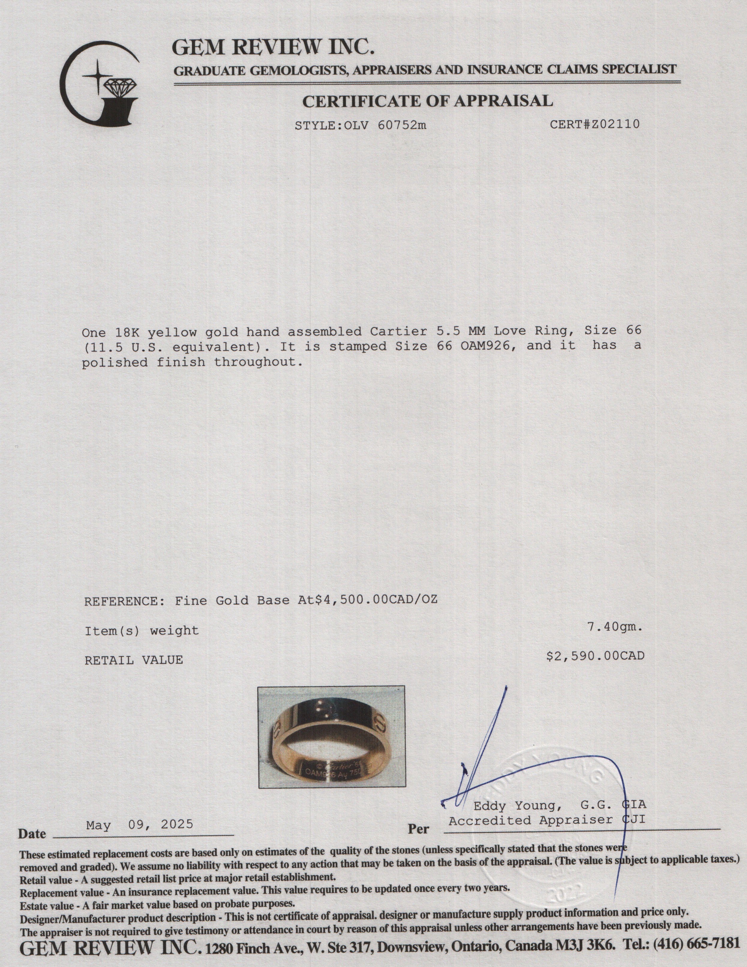 2024 18k Yellow Gold 5.5 MM Love Ring, Size 66 11.5 w/ Box, Certificate & Receipt
