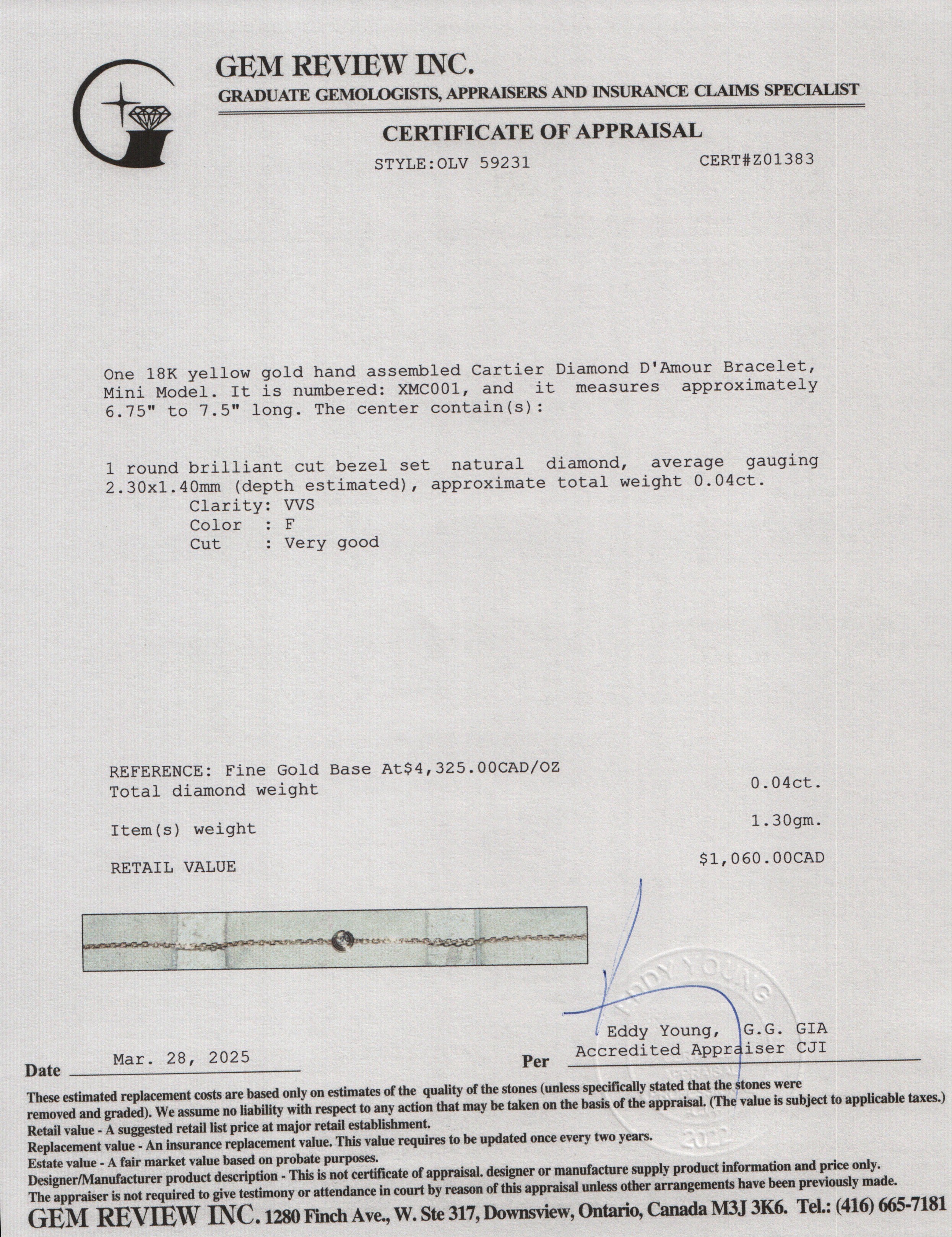 2024 18k Yellow Gold Diamond D'Amour Bracelet, Mini Model w/ Receipt