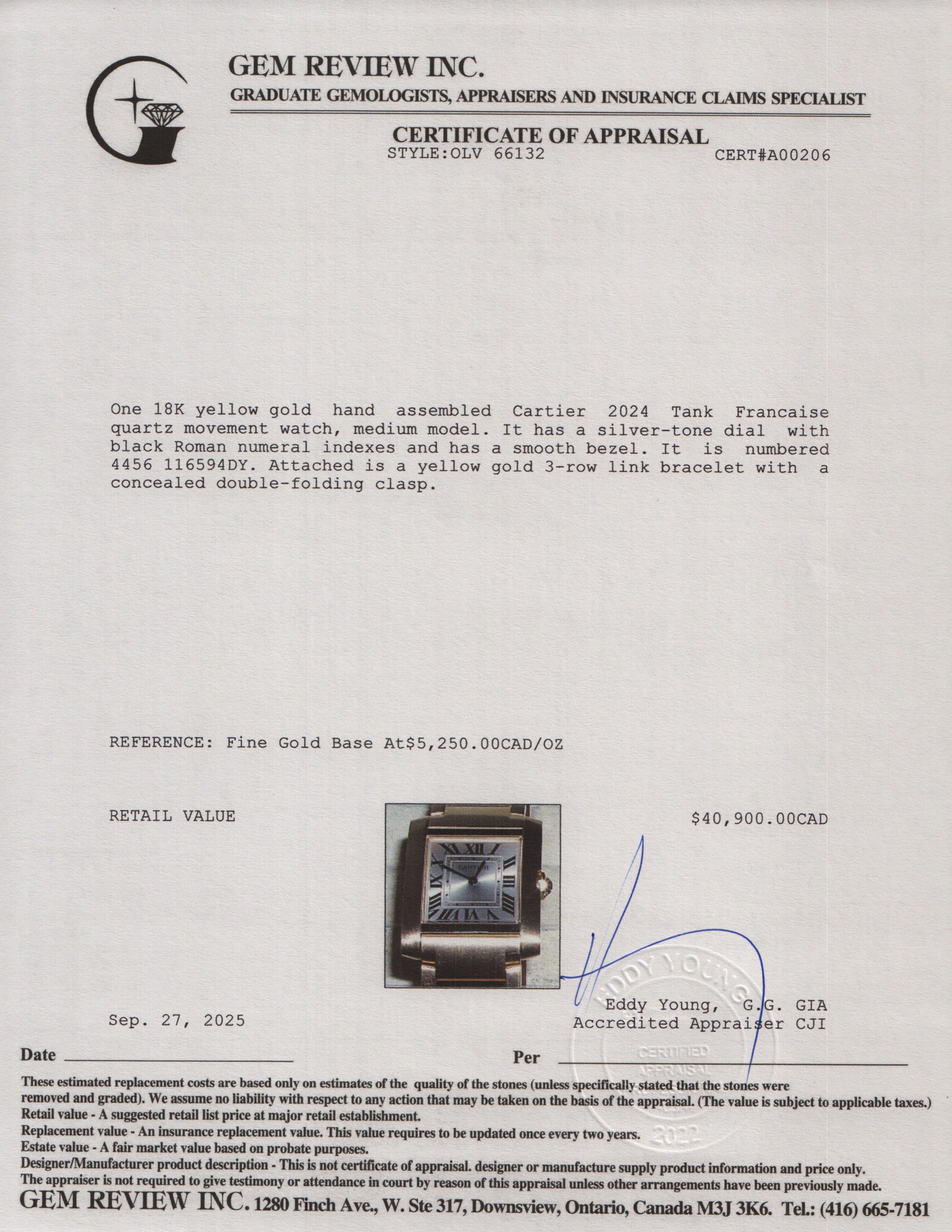 2024 18k Yellow Gold Tank Francaise Watch, Medium Model 4456 w/ Box & Papers