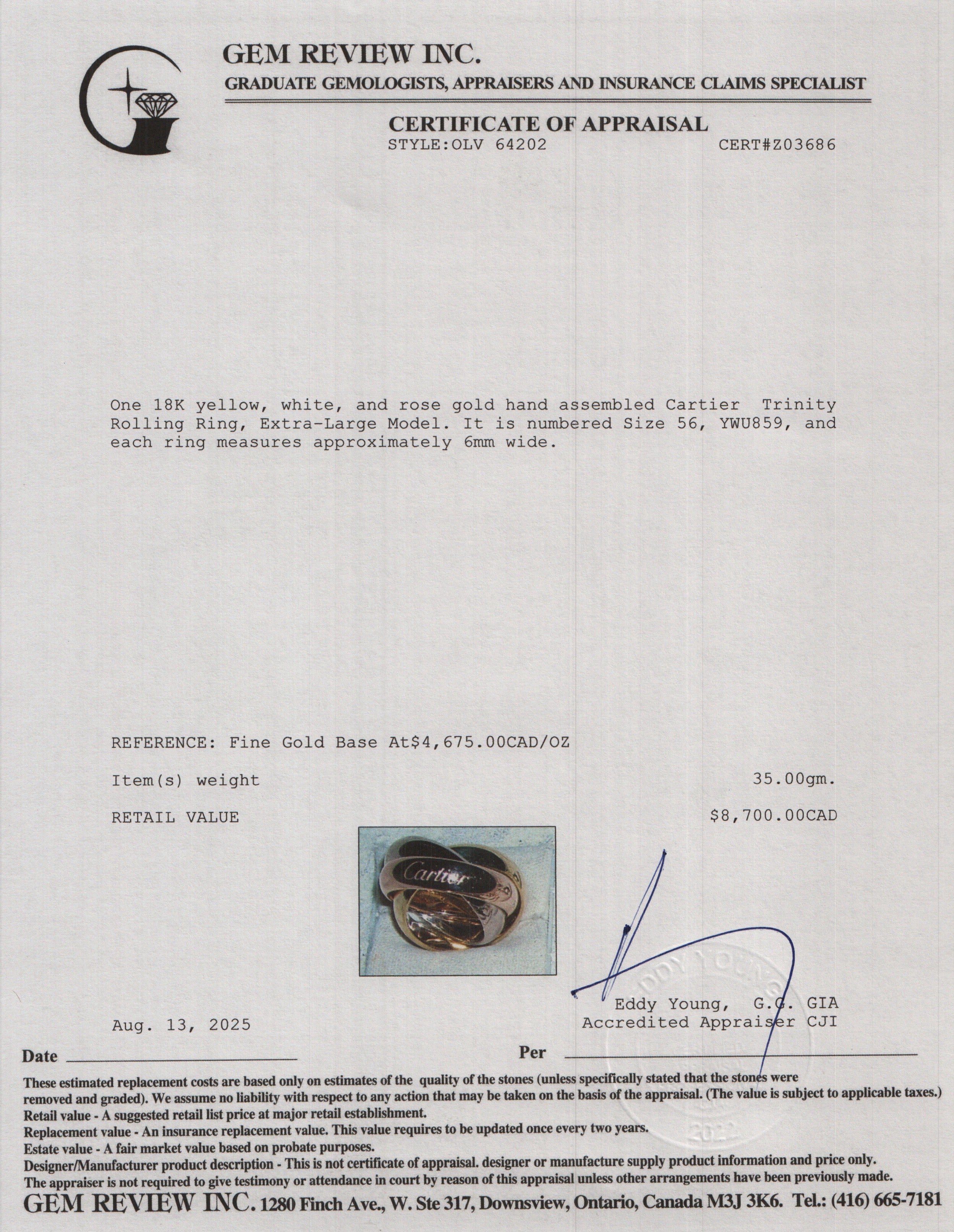 2025 18k Tri-Gold Trinity Rolling Ring, Extra-Large Model Size 56 7 w/ Box & Certificate