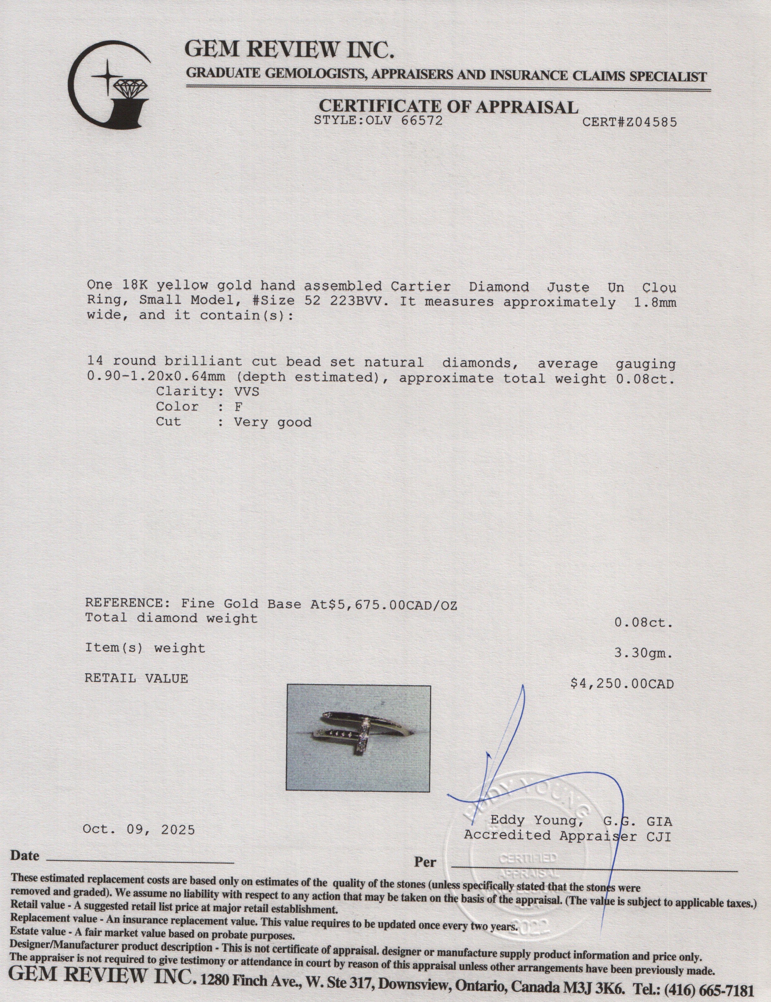 2025 18k Yellow Gold Diamond Juste Un Clou Ring, Small Model Size 52 6.25 w/ Box & Certificate