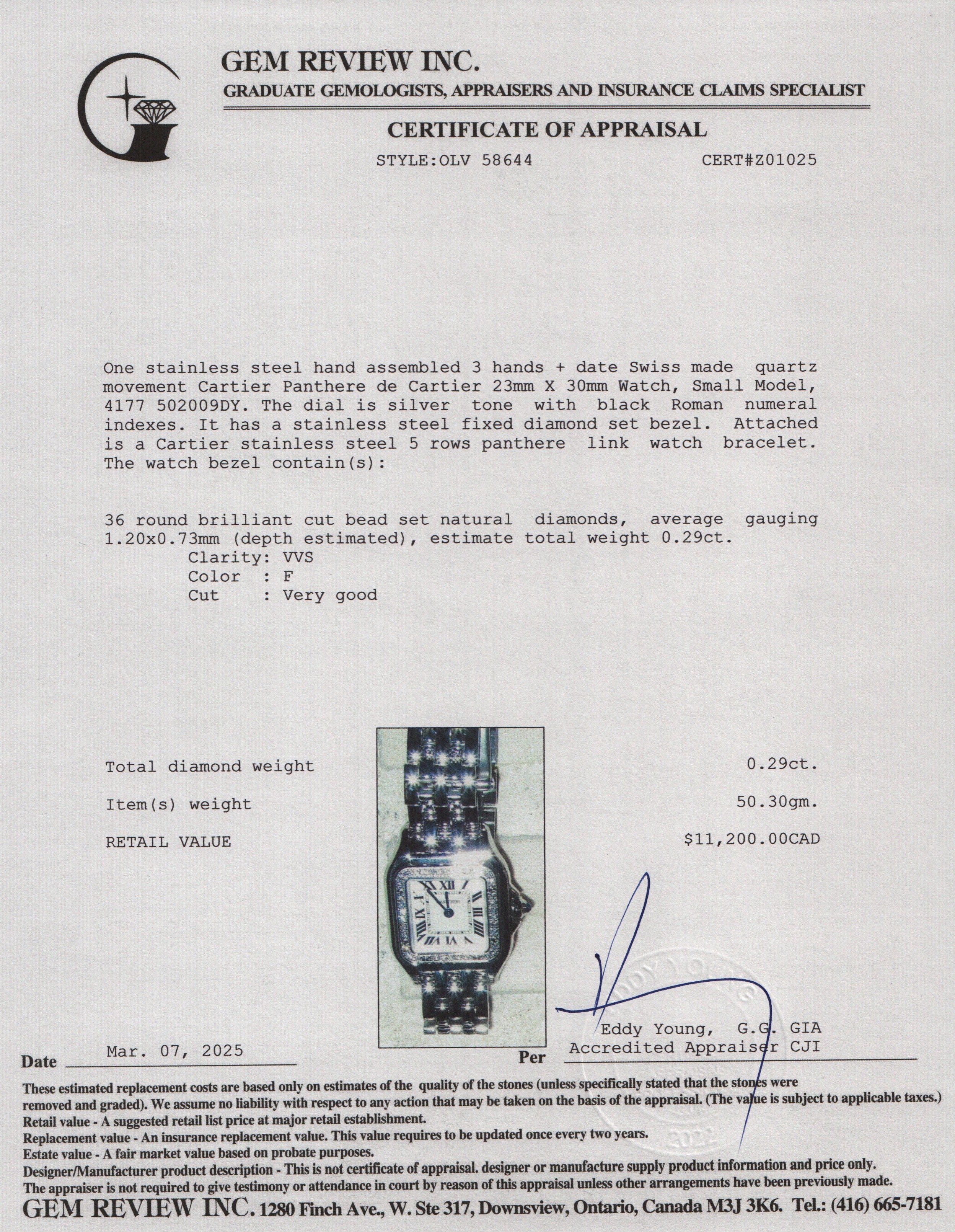2025 Stainless Steel Diamond Bezel Panthere de Watch, Small Model 4177 w/ Box & Papers