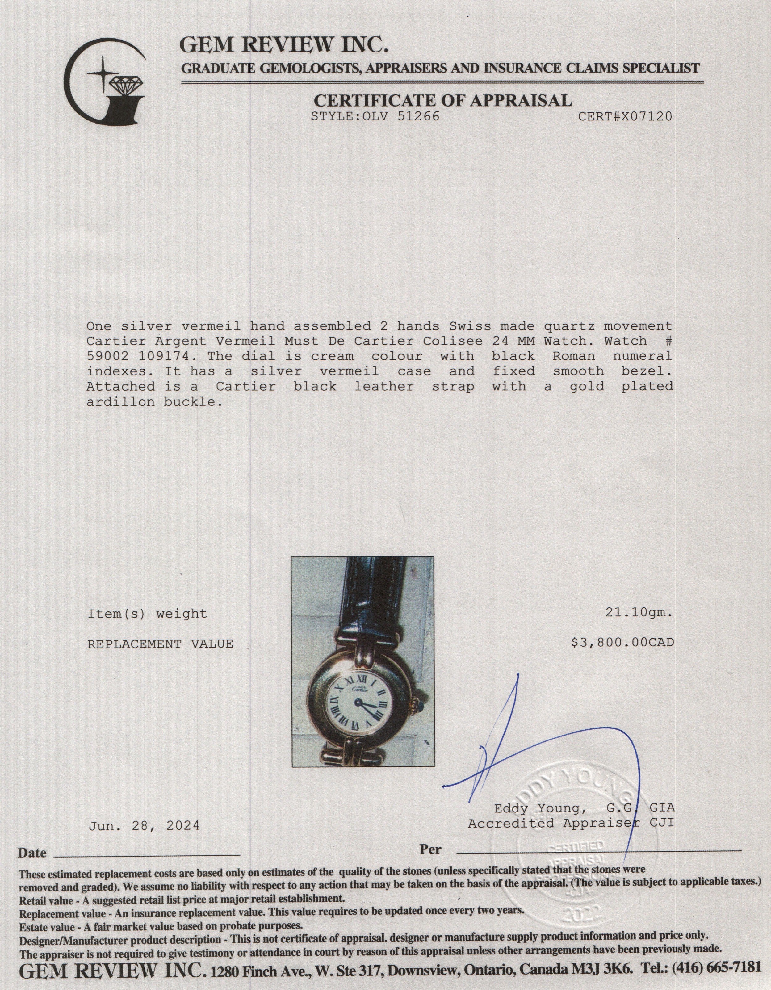 Argent Vermeil Must De Colisee 24 MM Watch w/ Box & Certificate