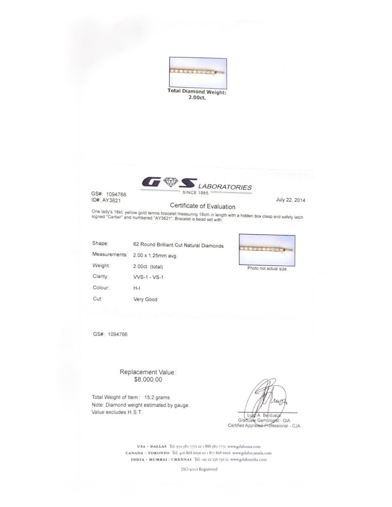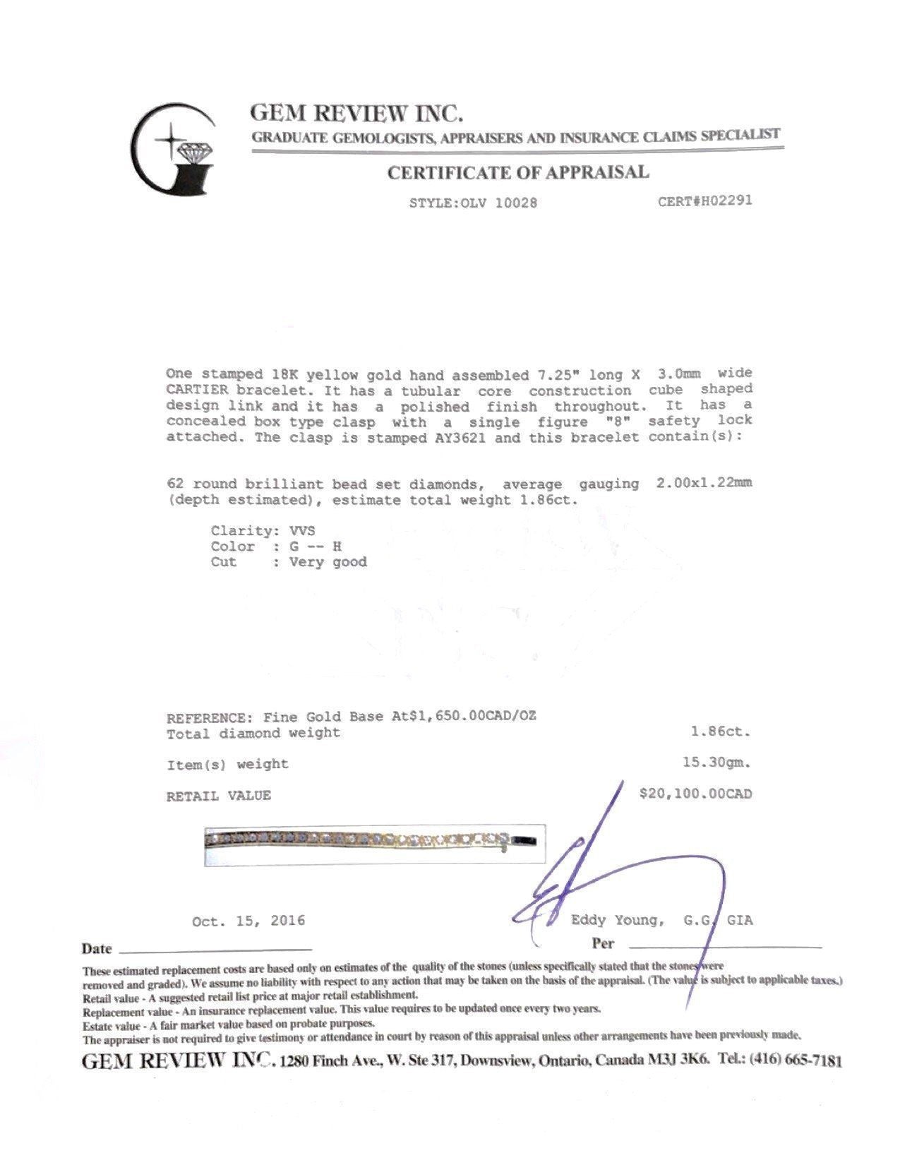 Cartier Diamond Lanieres Bracelet in 18kt Yellow Gold; Contains 62 Round Brilliant Cut Diamonds Totaling Approximately 1.86 ct. of VVS Clarity, G Colour, Very Good Cut; 7.25" long; Comes with Gem Review Appraisal