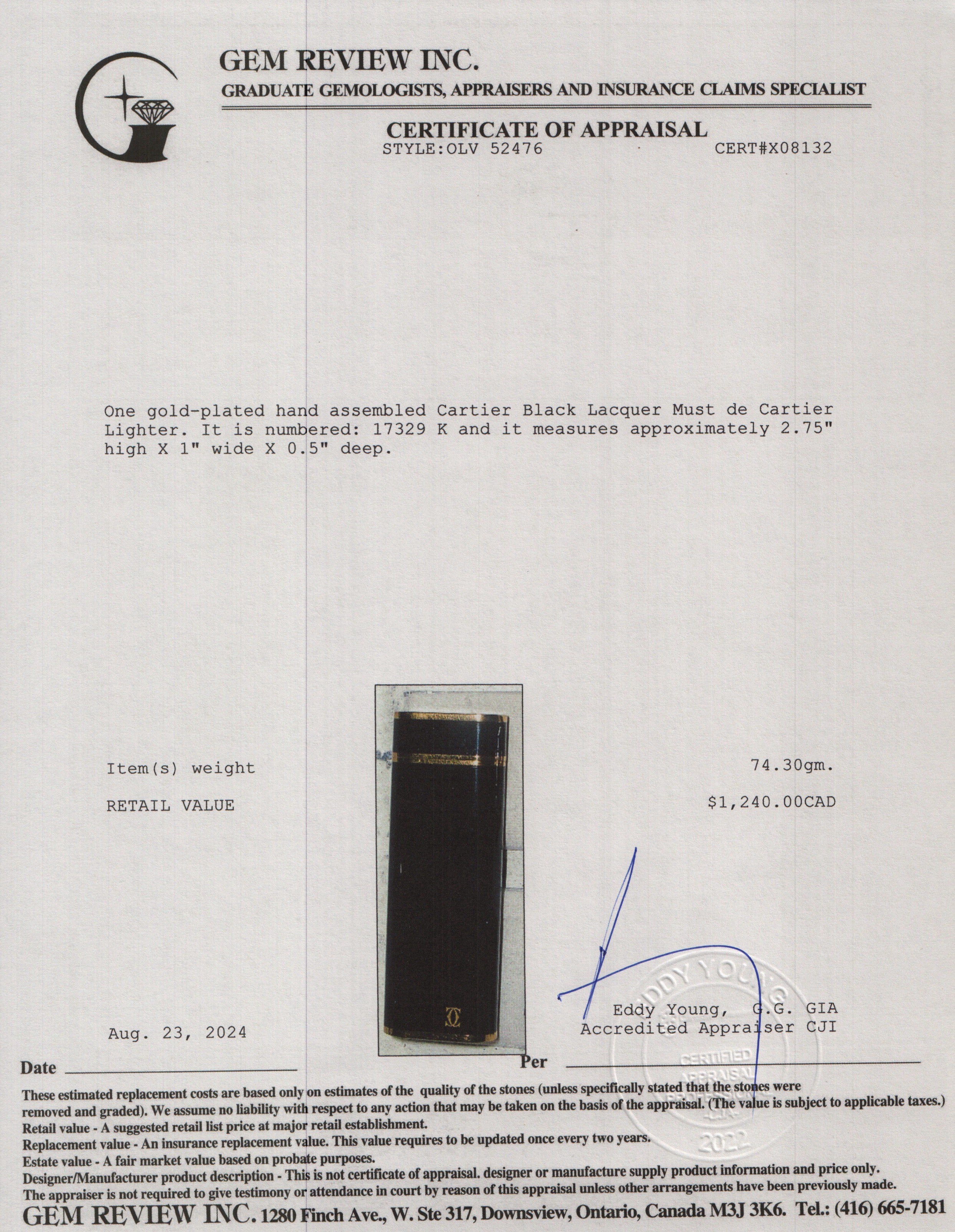 Gold-Plated Black Lacquer Must de Lighter w/ Box & Papers