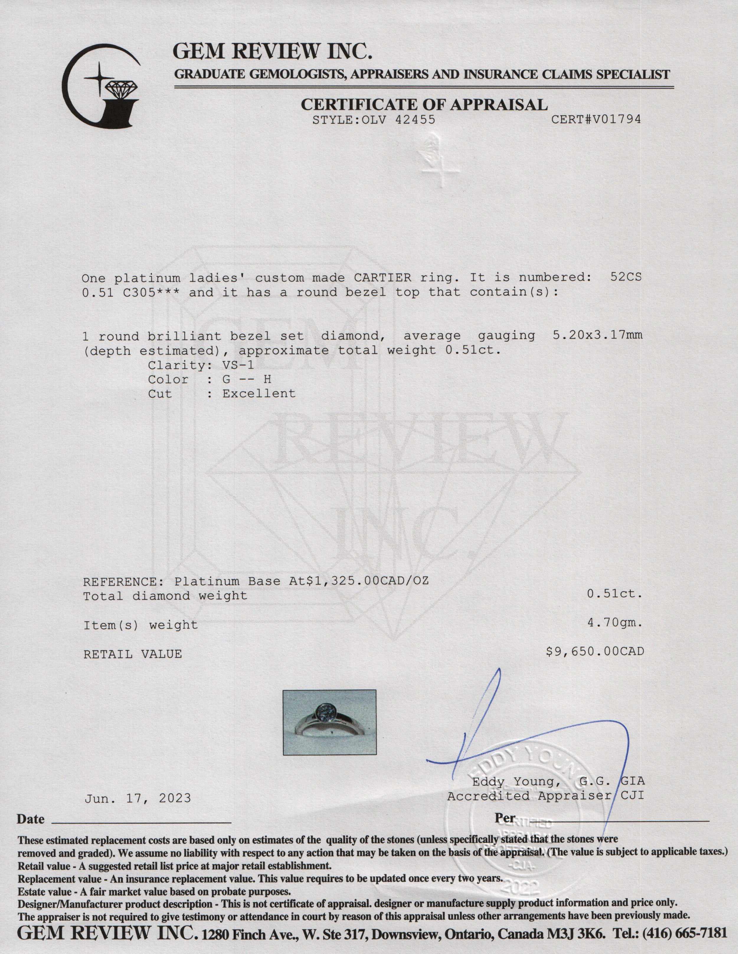- Signature/Hallmarks: Cartier PT950 52CS 0.51 C305***
