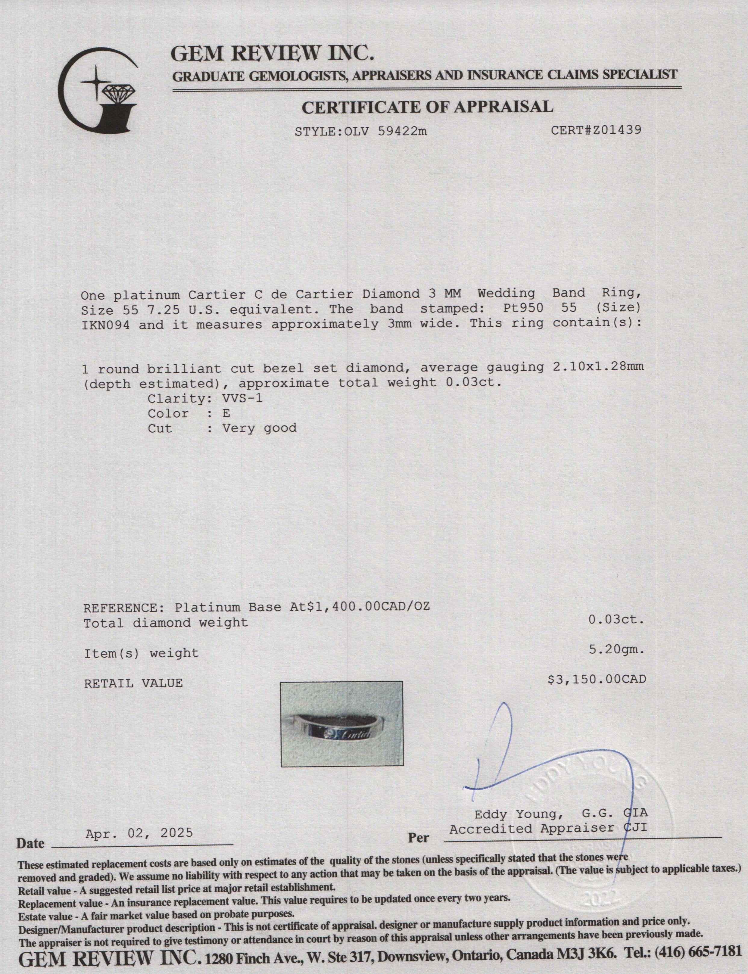 Platinum C de Diamond 3 MM Wedding Band Ring, Size 55 7.25