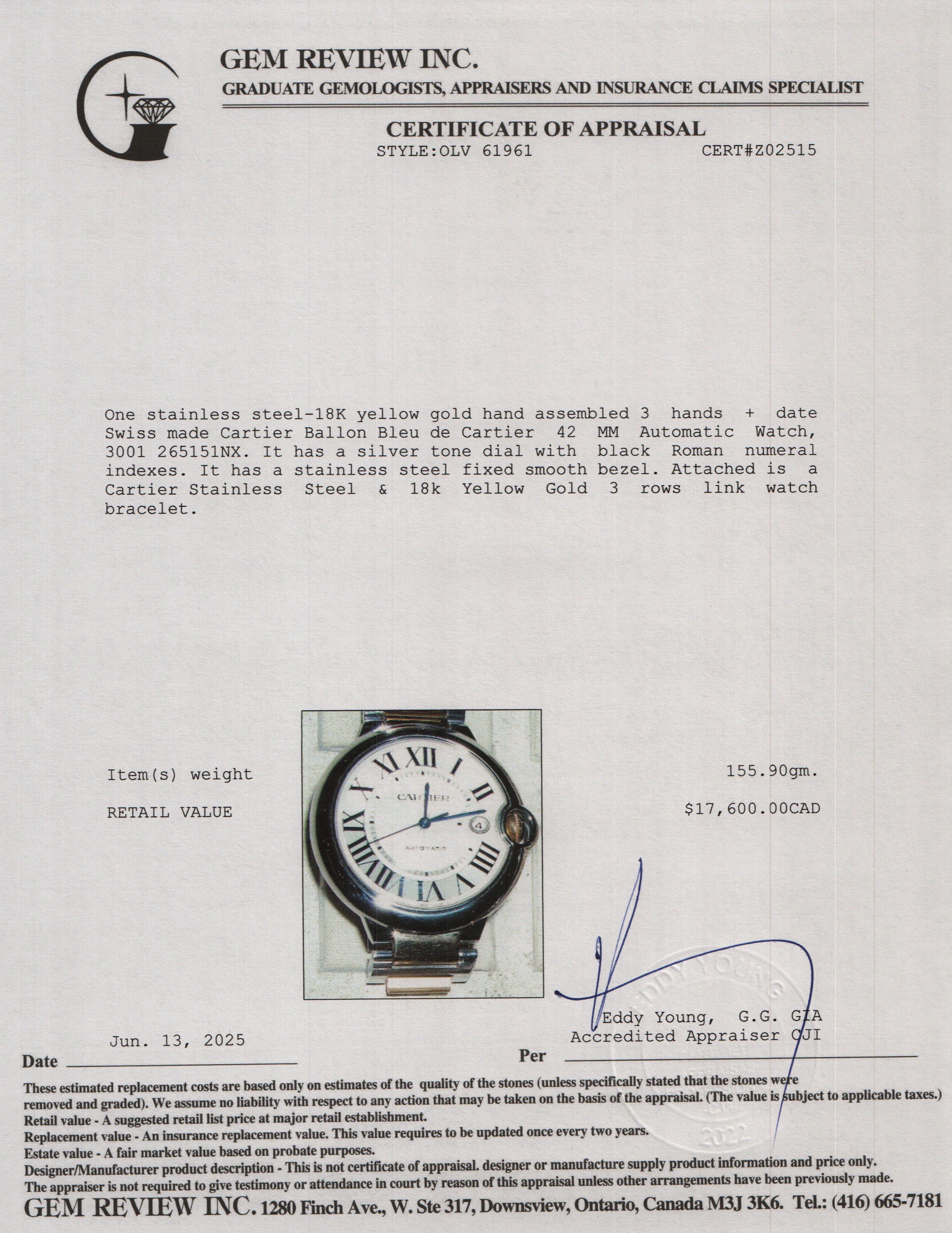 Stainless Steel & 18k Yellow Gold Ballon Bleu de 42 MM Automatic Watch 3001 w/ Box & Papers