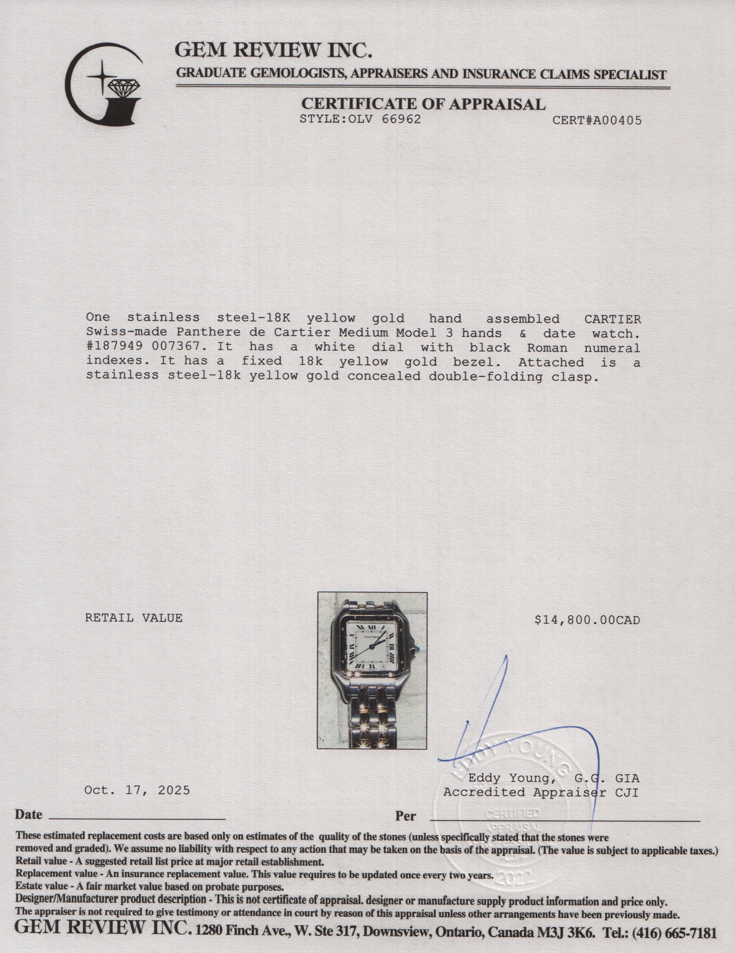 Stainless Steel & 18k Yellow Gold Panthere de Watch, Medium Model w/ Pouch , Certificate & Service Papers