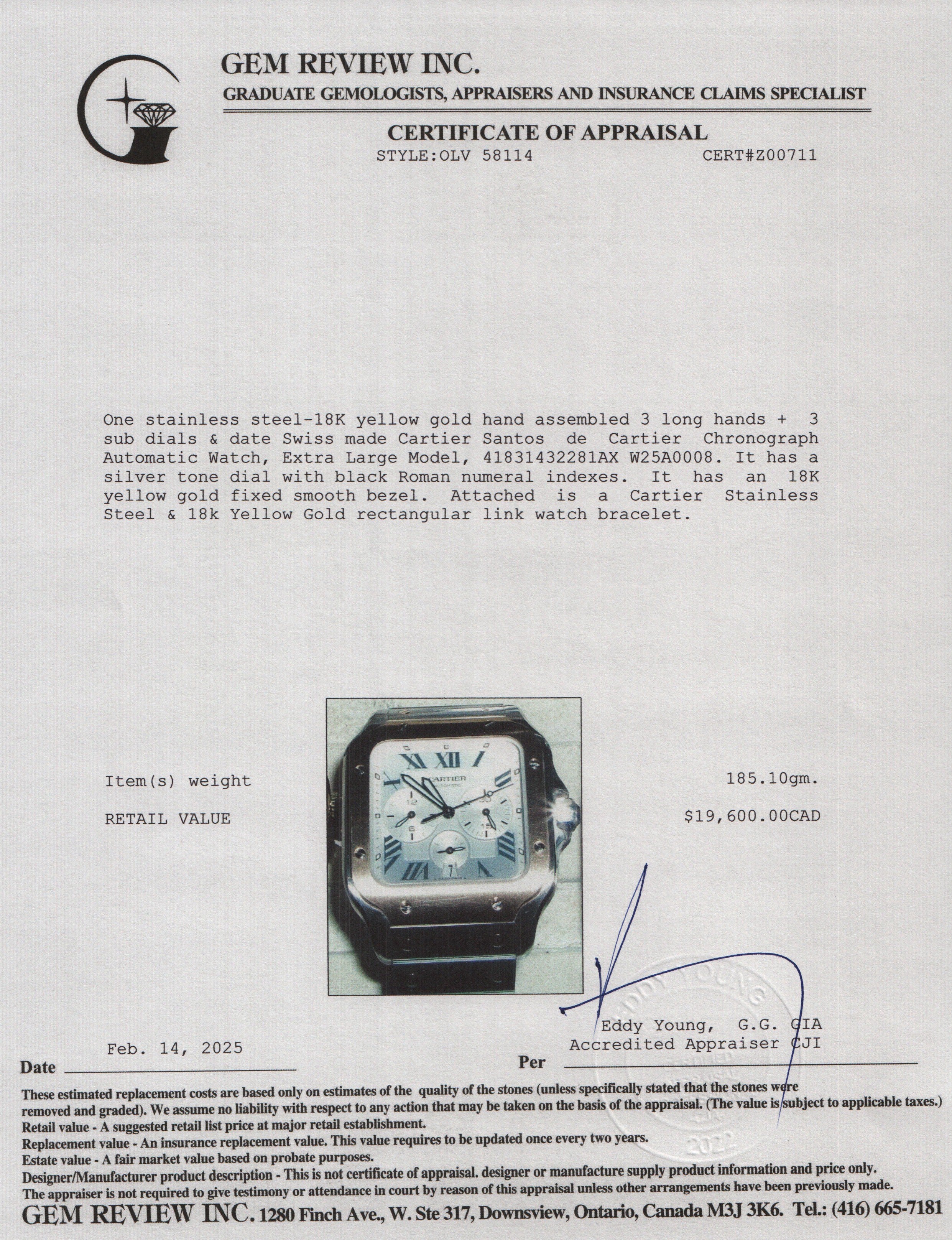 Stainless Steel & 18k Yellow Gold Santos de Chronograph Automatic Watch, Extra Large Model 4183 w/ Box, Papers & Extra Straps