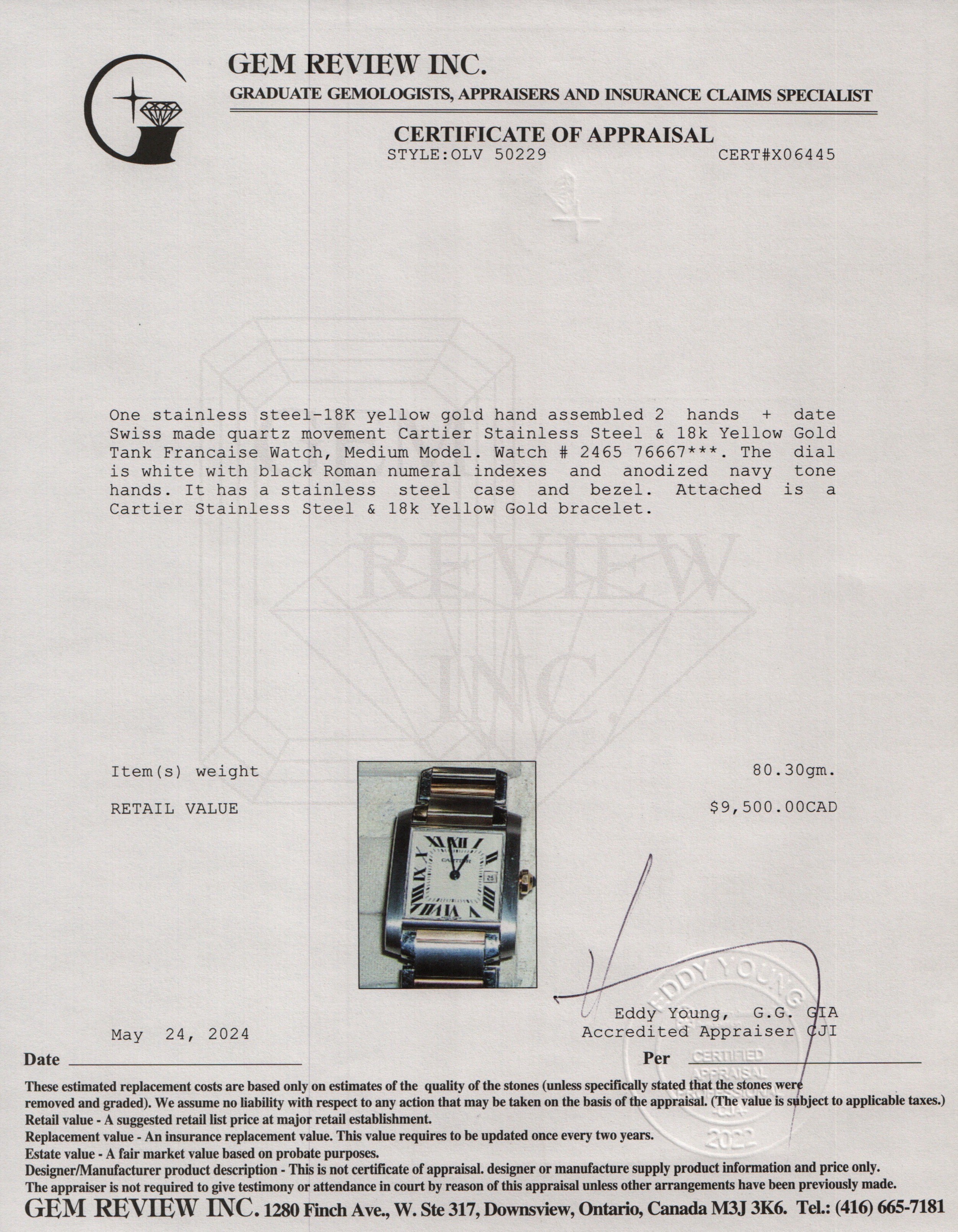 Stainless Steel & 18k Yellow Gold Tank Francaise Watch, Medium Model 2465 w/ Pouch & Papers
