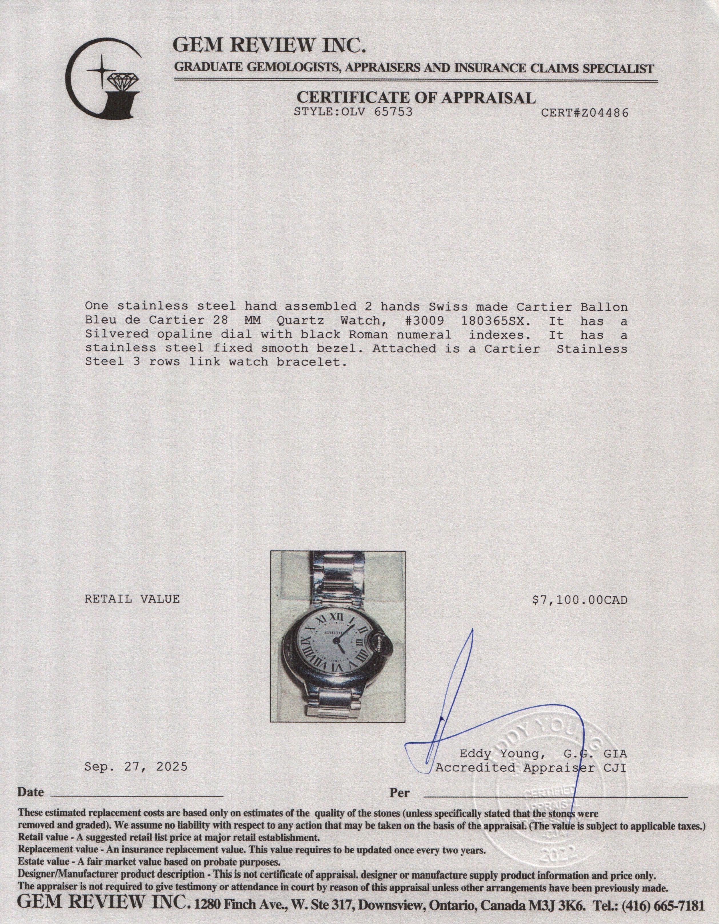 Stainless Steel Ballon Bleu de 28 MM Quartz Watch 3009 w/ Box & Papers