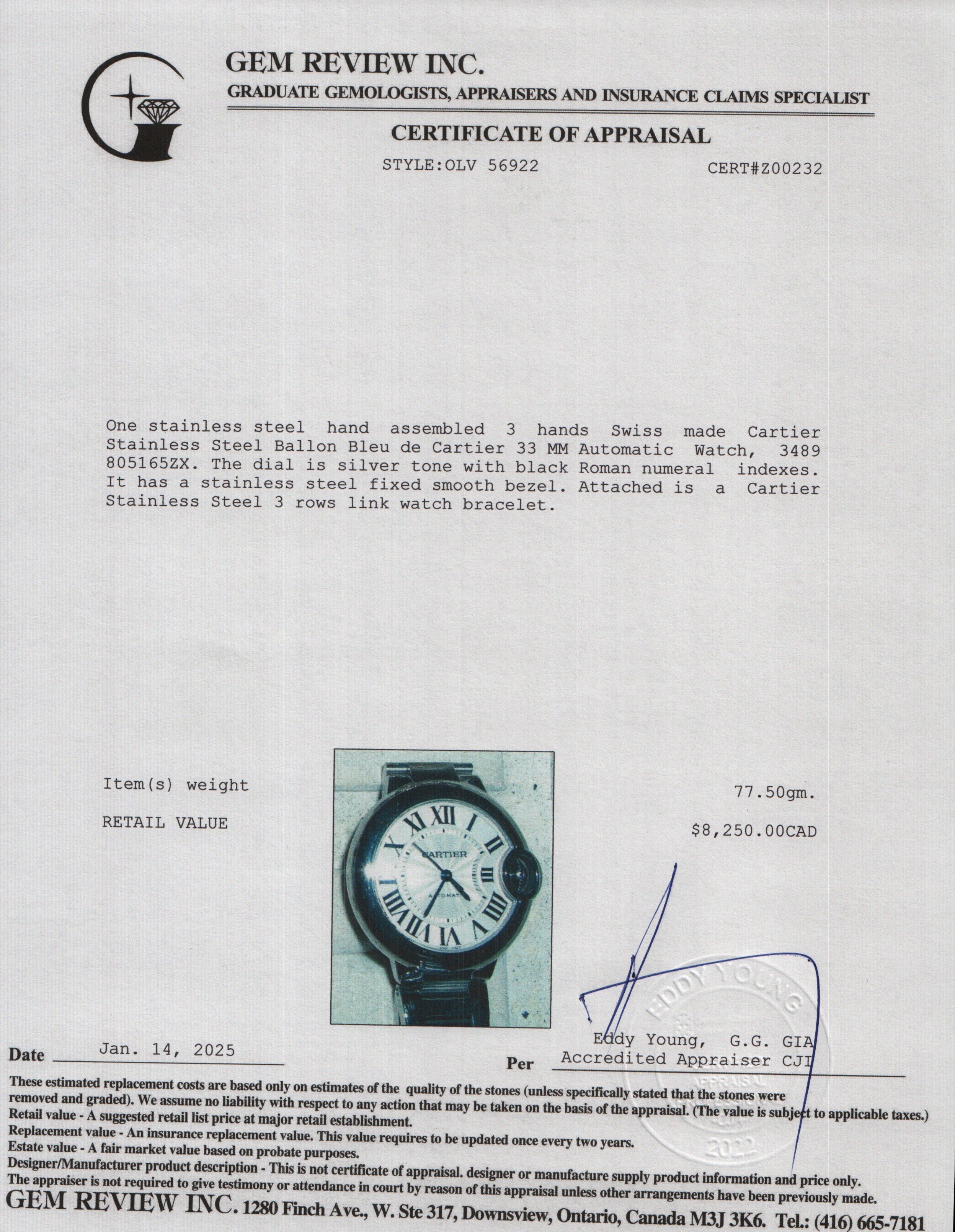 Stainless Steel Ballon Bleu de 33 MM Automatic Watch 3489 w/ Box & Papers