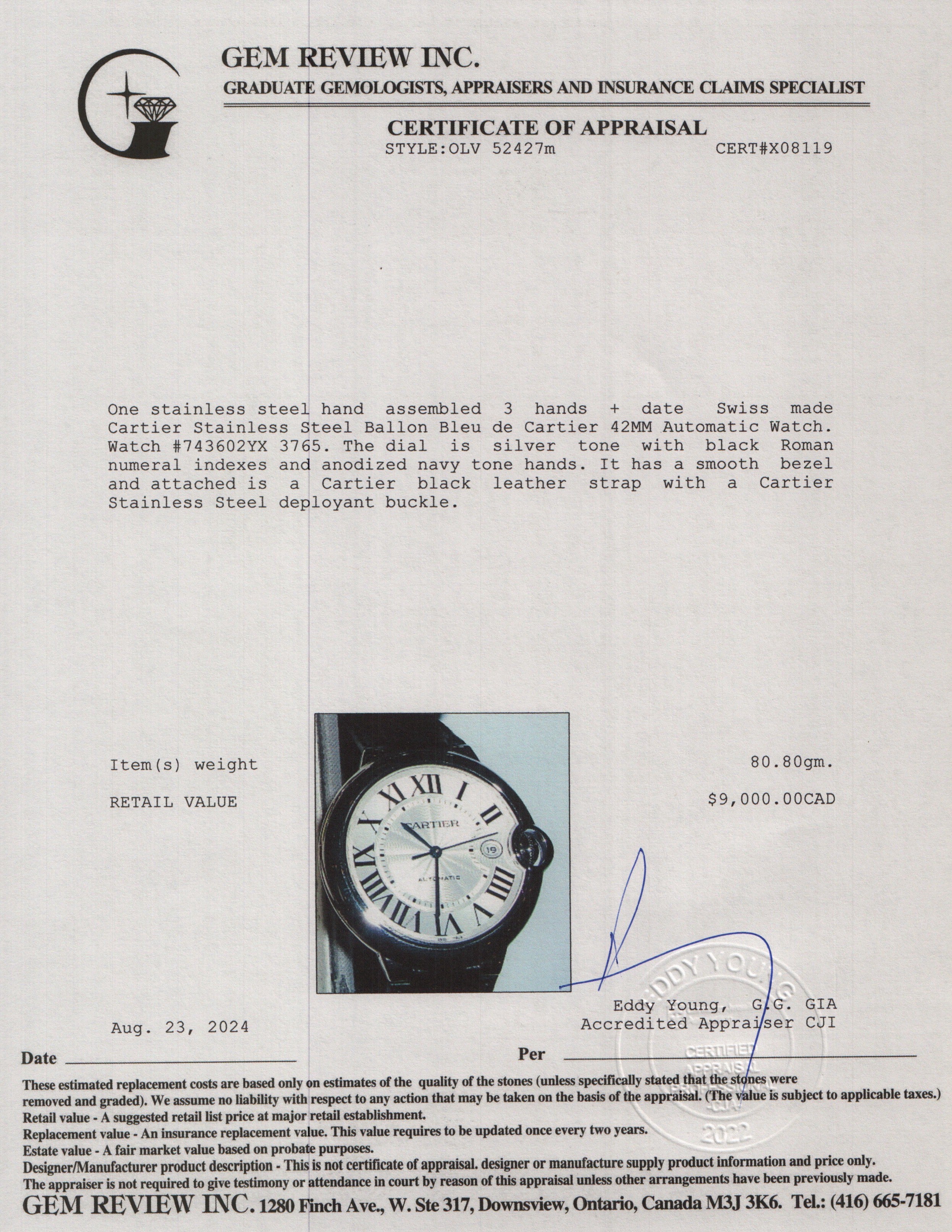 Stainless Steel Ballon Bleu de 42MM Automatic Watch 3765 w/ Box