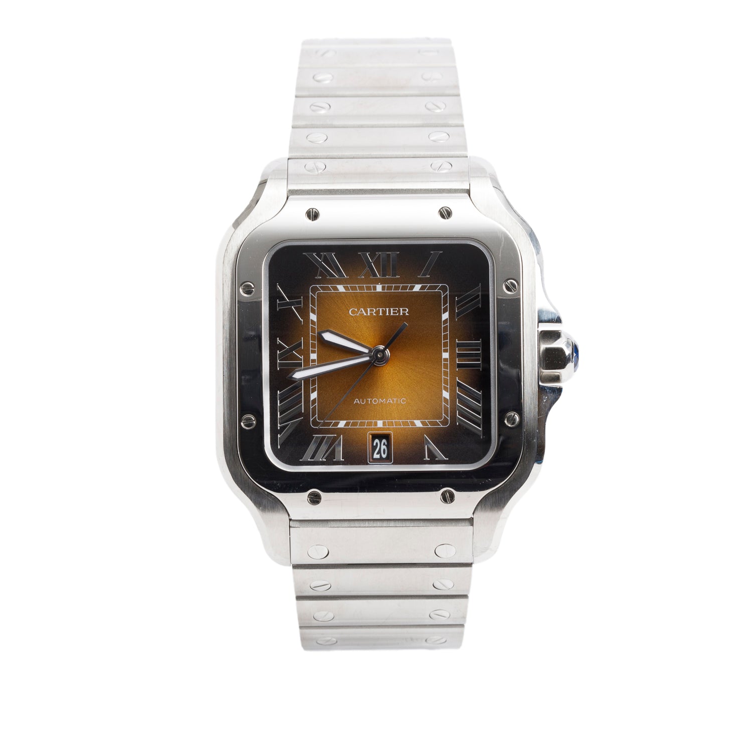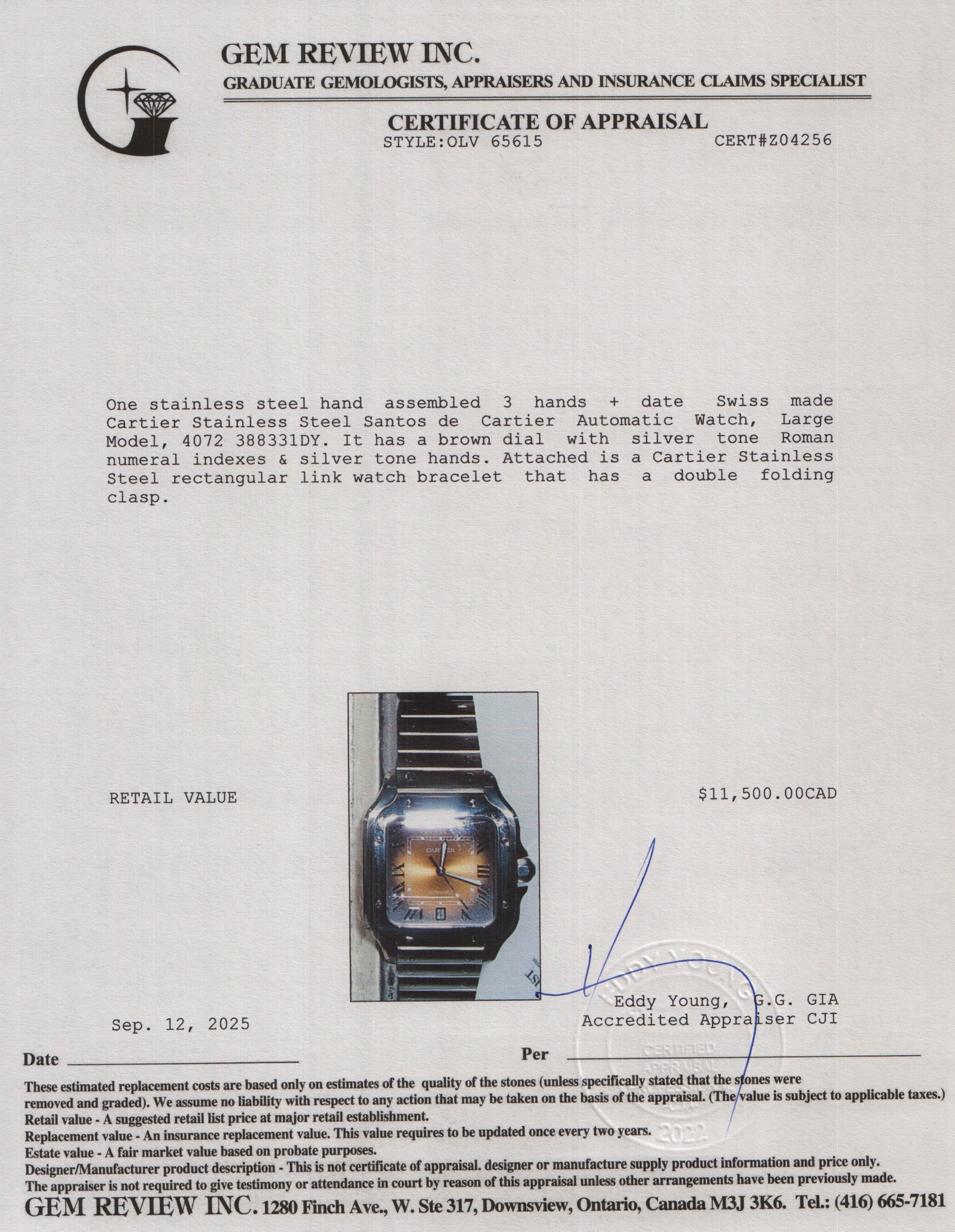 Stainless Steel Santos de Automatic Watch, Large Model Brown Dial 4072 w/ Box, Papers & Extra Strap