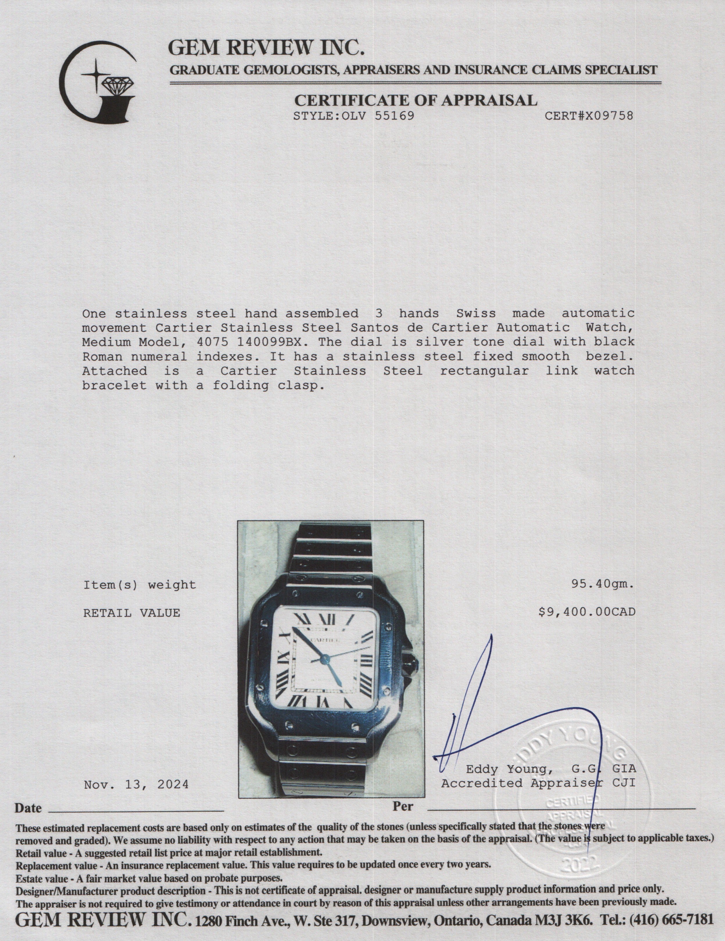 Stainless Steel Santos de Automatic Watch, Medium Model 4075 w/ Box & Papers