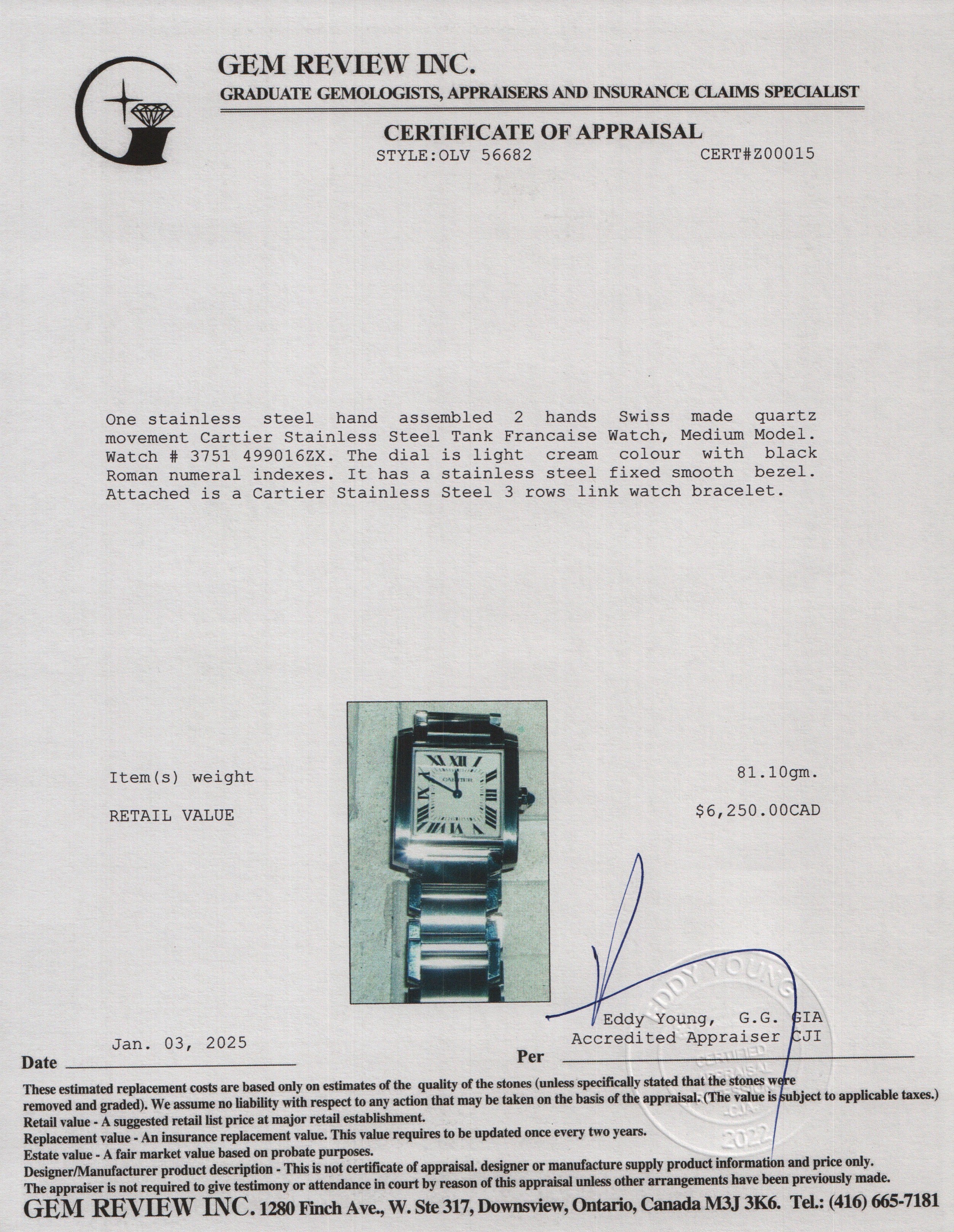 Stainless Steel Tank Francaise Watch, Medium Model 3751 w/ Box & Papers