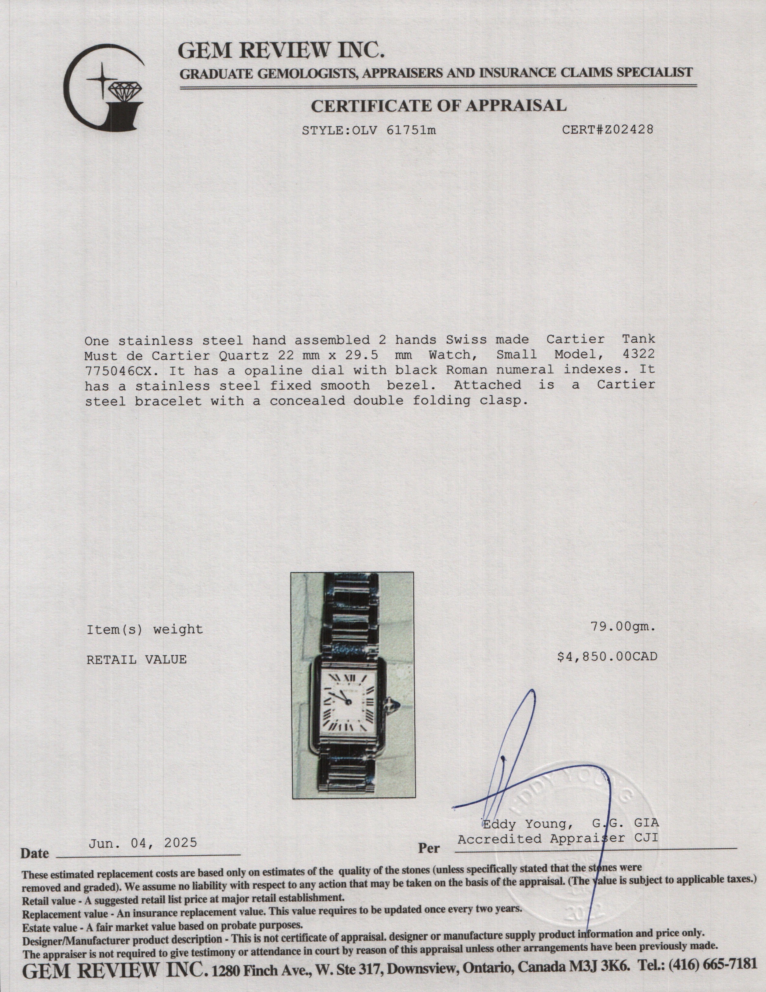 Stainless Steel Tank Must de Quartz Watch, Small Model 4322 w/ Box, Papers & Extra Leather Strap