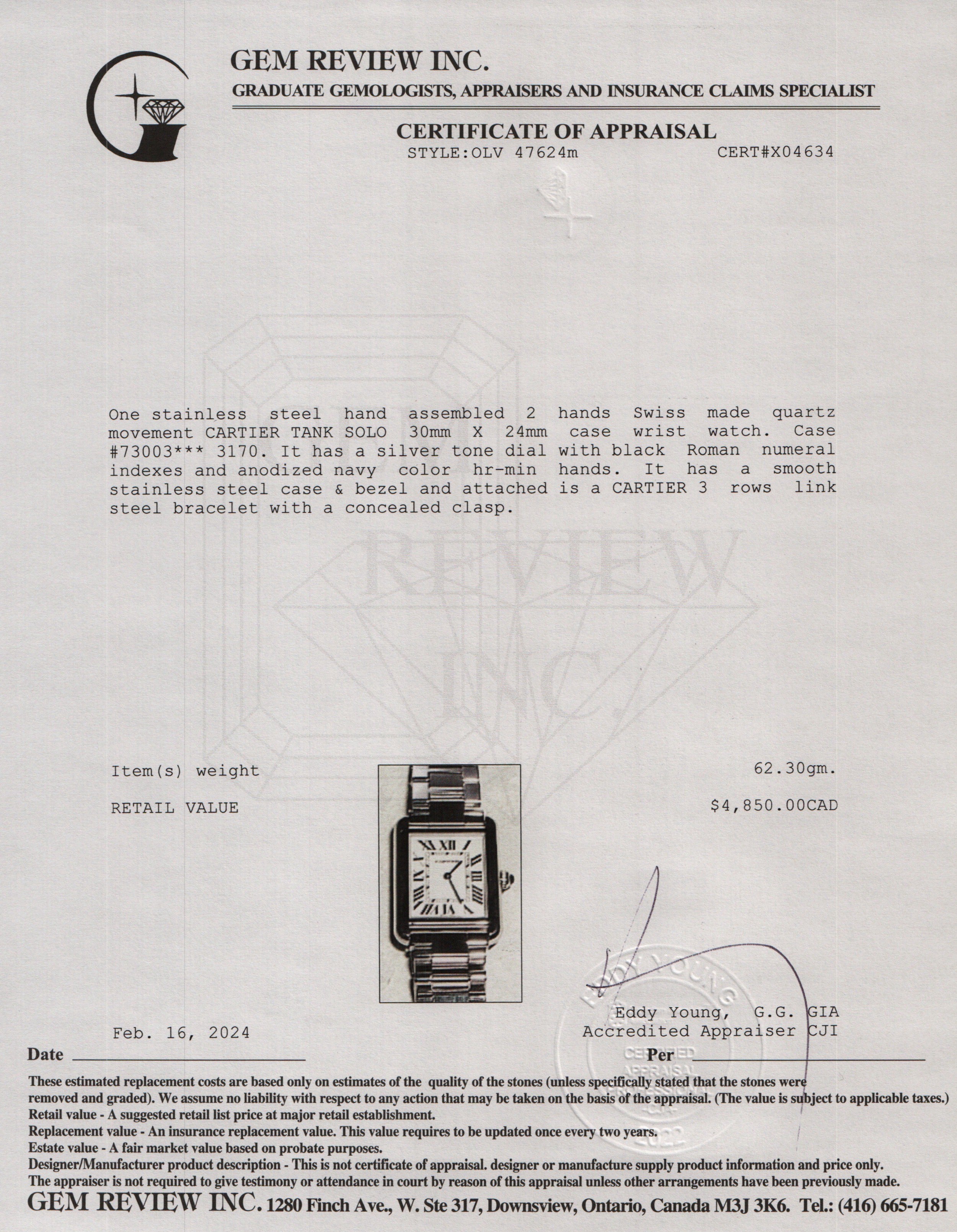 Stainless Steel Tank Solo 24 MM Watch, Small Model w/ Box & Receipt