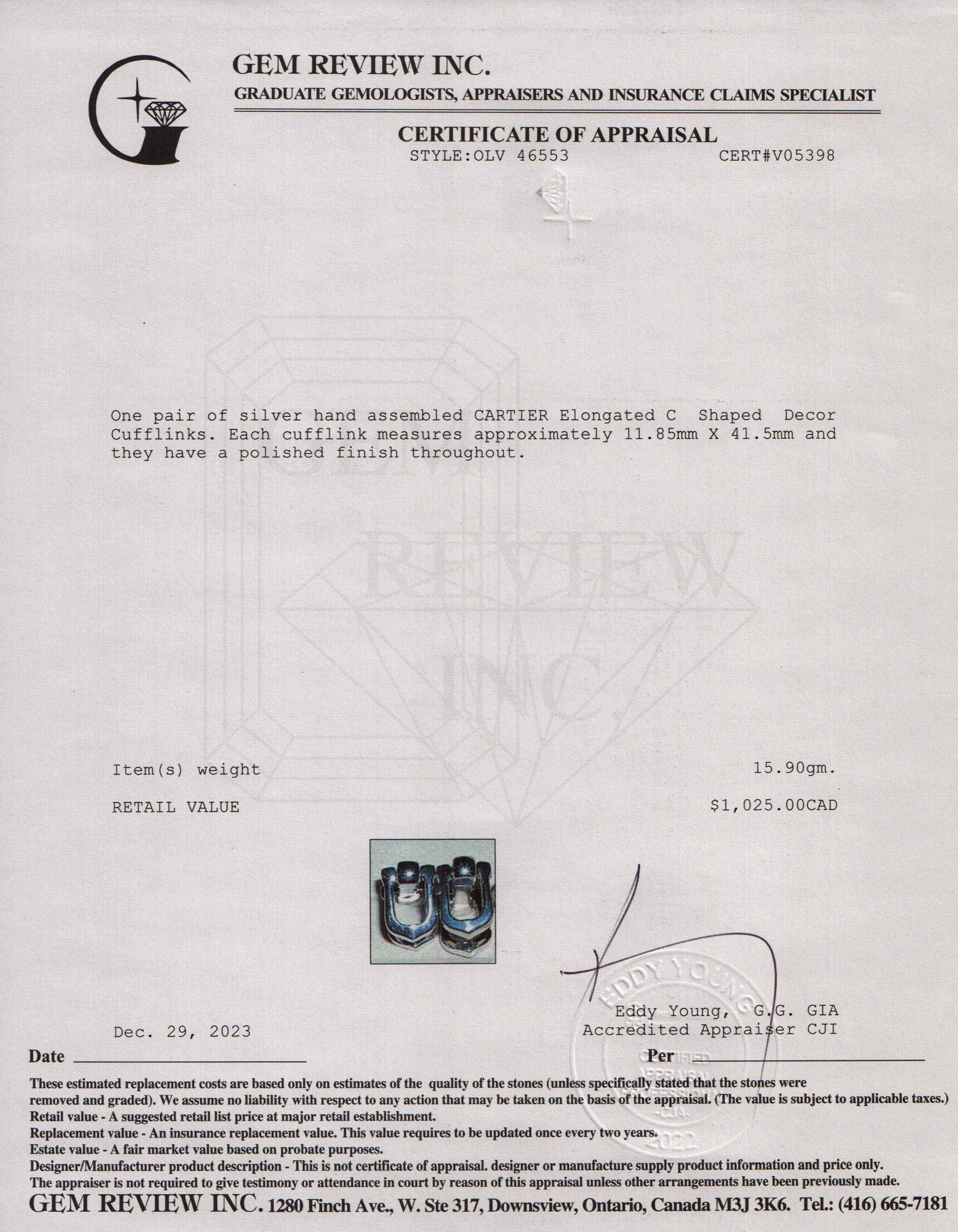Sterling Silver Elongated C Shaped Decor Cufflinks w/ Box & Certificate